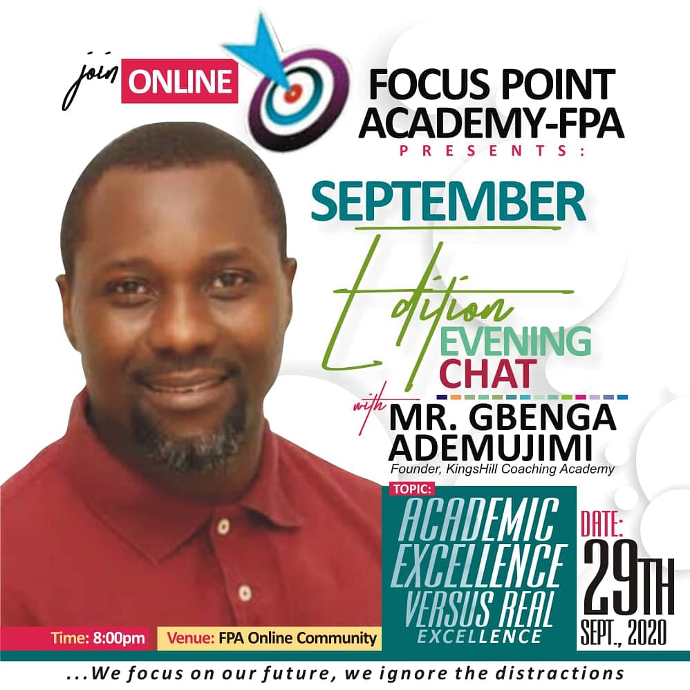 On the 29th of September 2020, Focus Point Academy-FPA, organised an online chat with Mr. Gbenga Ademujimi,. Gbenga Ademujimi, a Certified Life Coach for Human Design Systems and NLP Practitioner from The Coaching Academy, U.K., on the topic “Academic Excellence versus Real Excellence