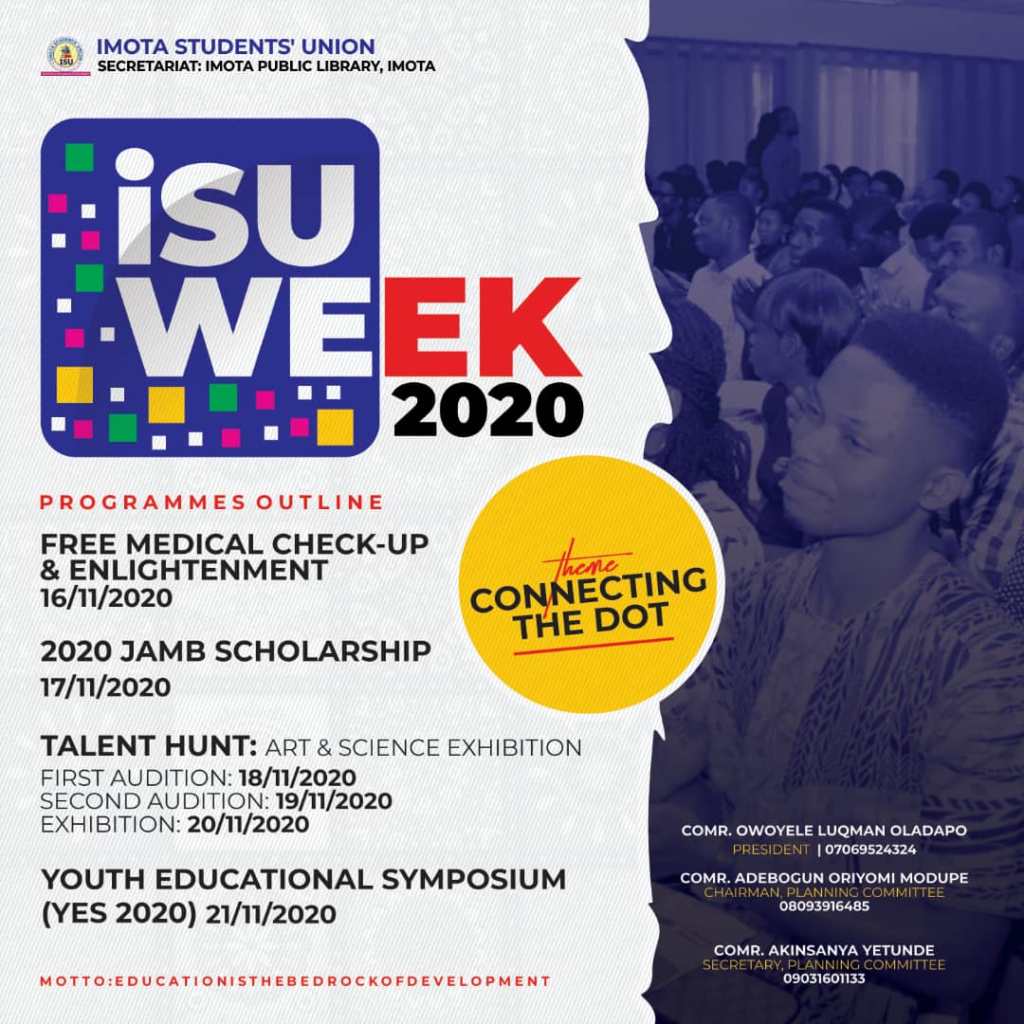 Feeding response to questions on the highlight of programme for this year’s ISU Week, the chairman stated that “due to the advent of the pandemic (Covid 19) and the current status of the economy, this year’s ISU Week program had been reduced to four days instead of the usual six to seven day’s program. We have considered programmes such as; Free Medical Check-Up & Enlightenment Exercise which will hold at Ranodu Palace, Imota; Jamb Form Scholarship Aptitude Test at Imota Community Grammar School, Imota; Talent Hunt: Art and Science Exhibition at Imota Public Library; and the grand finale, Youth Educational Symposium at Admos Hotel & Suites on 16th, 17th, 18 and 21st of November respectively.’’