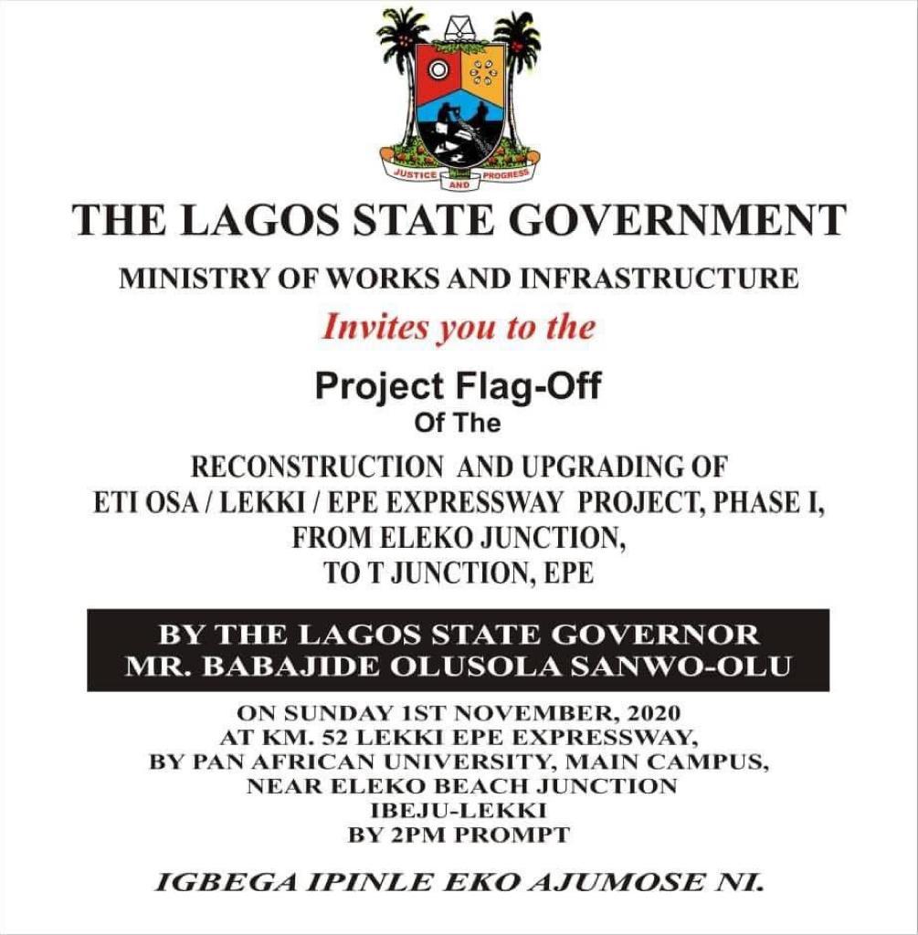 A new motoring experience is on the way on the Eti-Osa-Lekki-Epe Expressway with the Lagos State Government’s plan to rebuild the major road. The flag-off of the reconstruction and upgrade of the important road is Sunday, November 1, 2020.
