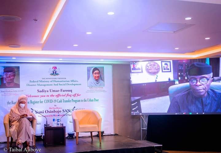 Vice President Prof Yemi Osinbajo SAN GCON has commended the Minister of Humanitarian Affairs, Disaster Management and Social Development Sadiya Umar Farouq for her innovation in upgrading the Rapid Response Register (RRR) for the Covid-19 Cash Transfer Project.