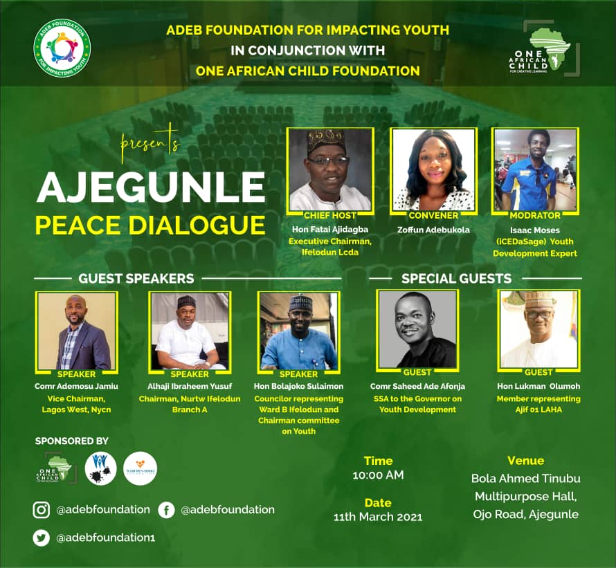 Adeb Foundation for Impacting Youth, a youth led Non-Governmental Organization in Conjunction with One African Child Foundation, Youth Coalition against Corruption(YOCAT) and Wadi Ben Hirki Foundation held a peace dialogue among community stakeholders in Ajegunle Community on Thursday, 11th March 2021.