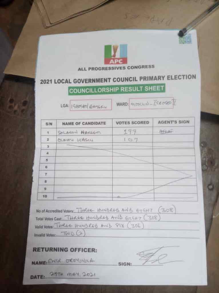 “Akeem Solawon popular known as Akile did not only defeat the incumbent councillor Hon. Wasiu Olowu, he won with a landslide. Our indefatigable Symbol, Solawon knocks out Wasiu Olowu with a vote margin of 92votes. While Wasiu Olowu polled 107votes, Solawon coasts home with 199votes.”