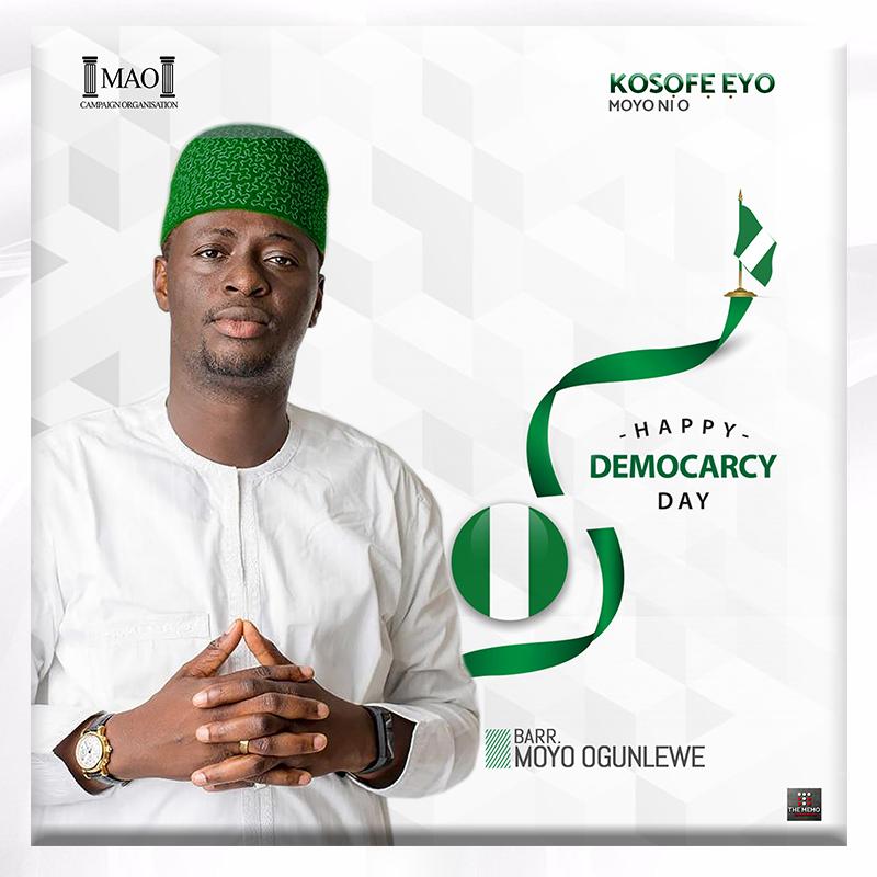 Barr. Moyosore Ogunlewe the APC Chairmanship candidate in Kosofe LG greets the people of his constituency and Nigeria on Democracy Day in a press release which goes thus:
