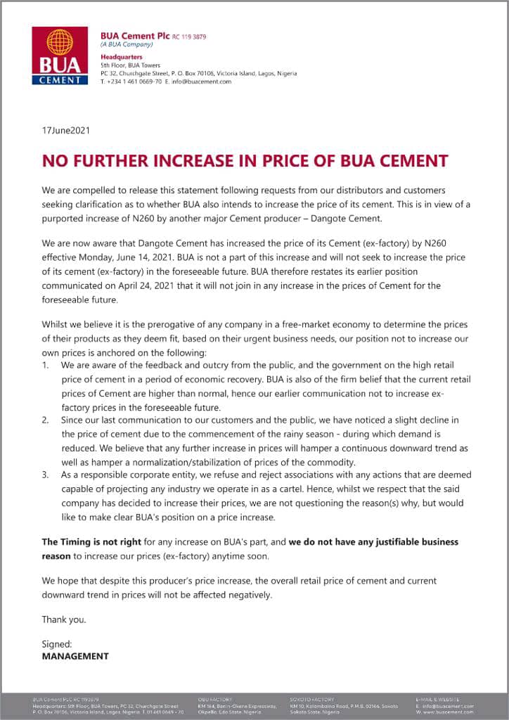 In a signed statement released this afternoon, the BUA group insists that it stands by its earlier decision not to increase cement price which was communicated on April 24, 2021.