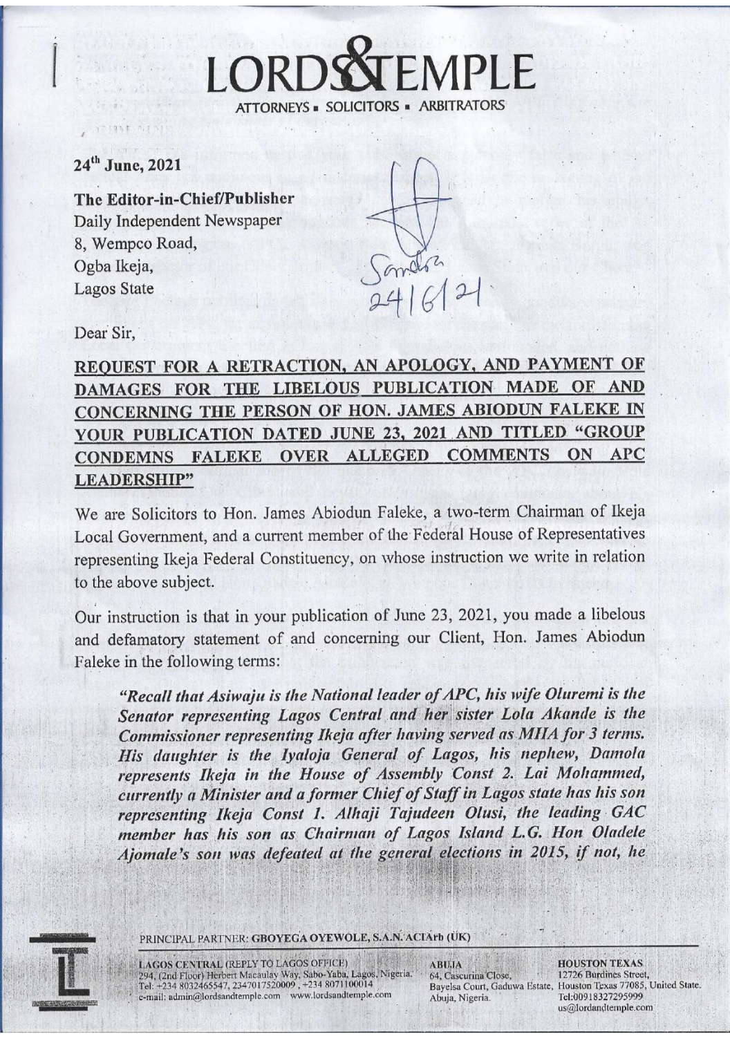 Representative of Lords & Temple, Gboyega Oyewole (SAN), who signed the letter on behalf of the law outfit warned that failure of the Daily Independent to do as demanded may constrain Hon. Faleke to “proceed to the court of law against the media organization for exemplary damages for injurious falsehood and malicious publication”