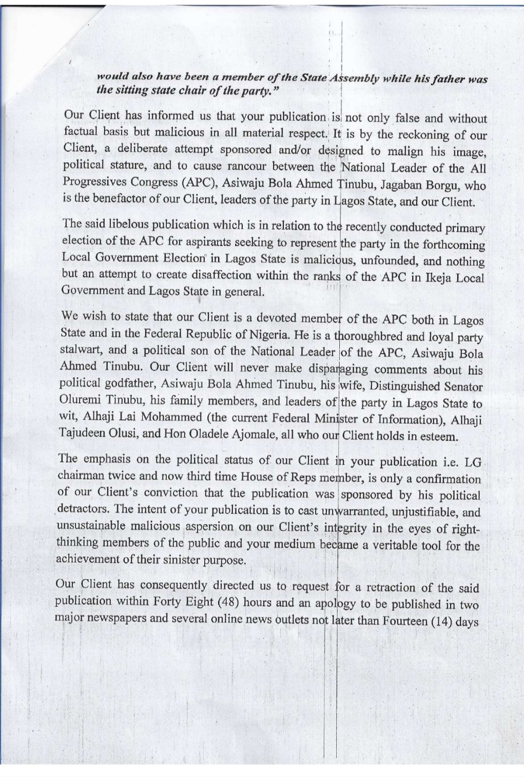 The demands of the lawmaker were conveyed in a letter written by his legal representatives, Lords & Temple and delivered to the ACME office of Daily independent on Thursday 24th of June under his instructions.