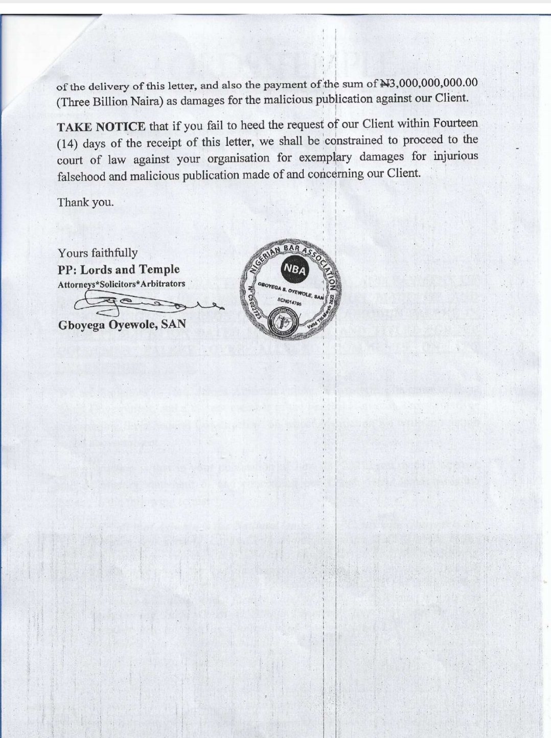 As a result, Hon Faleke has demanded a retraction of the said publication within 48 hours and an apology to b epublished in two major newspapers and several online news outlets not later than 14 days of receipt of the letter as well as a payment of N3 Billion as damages.