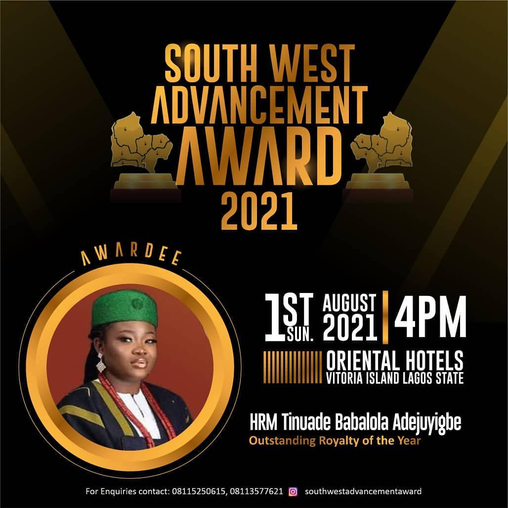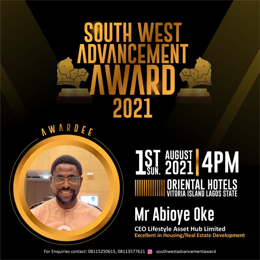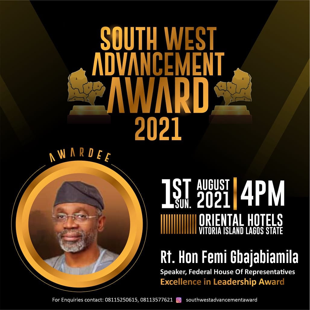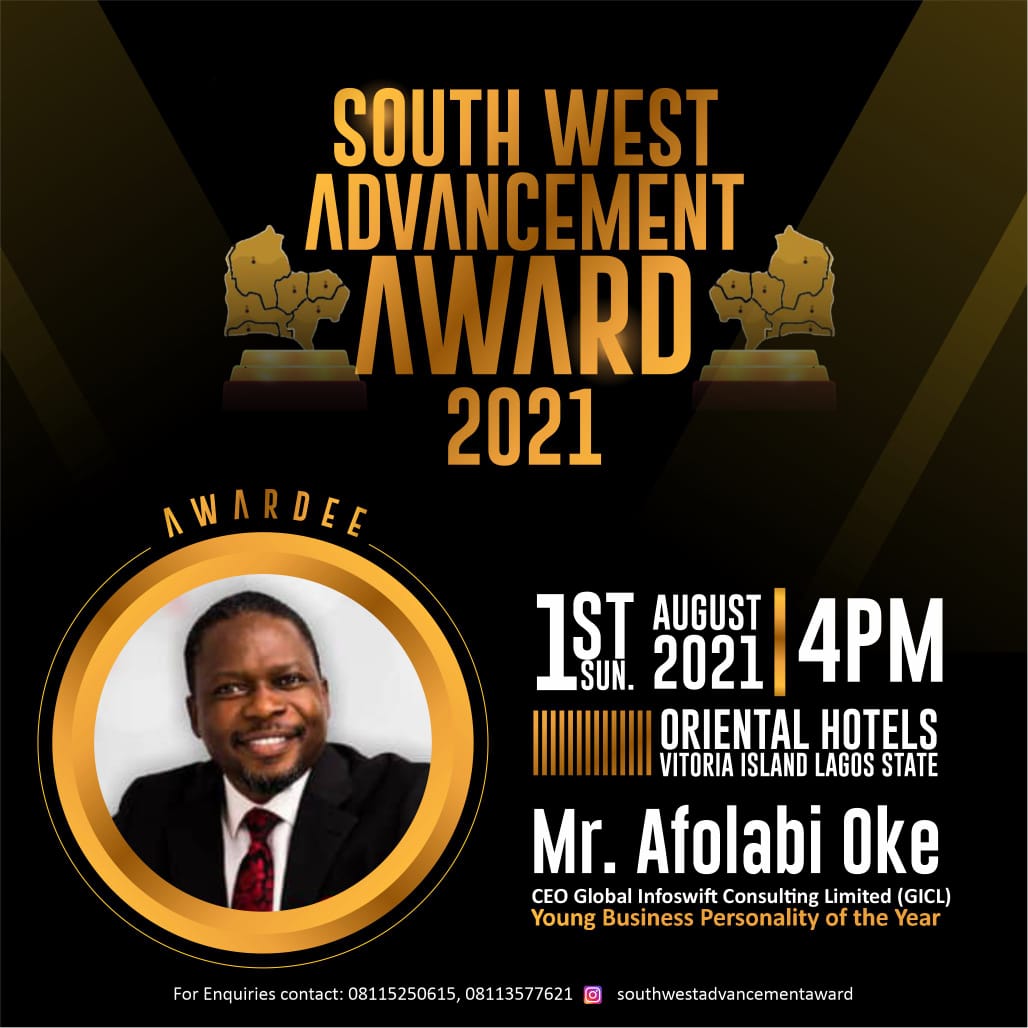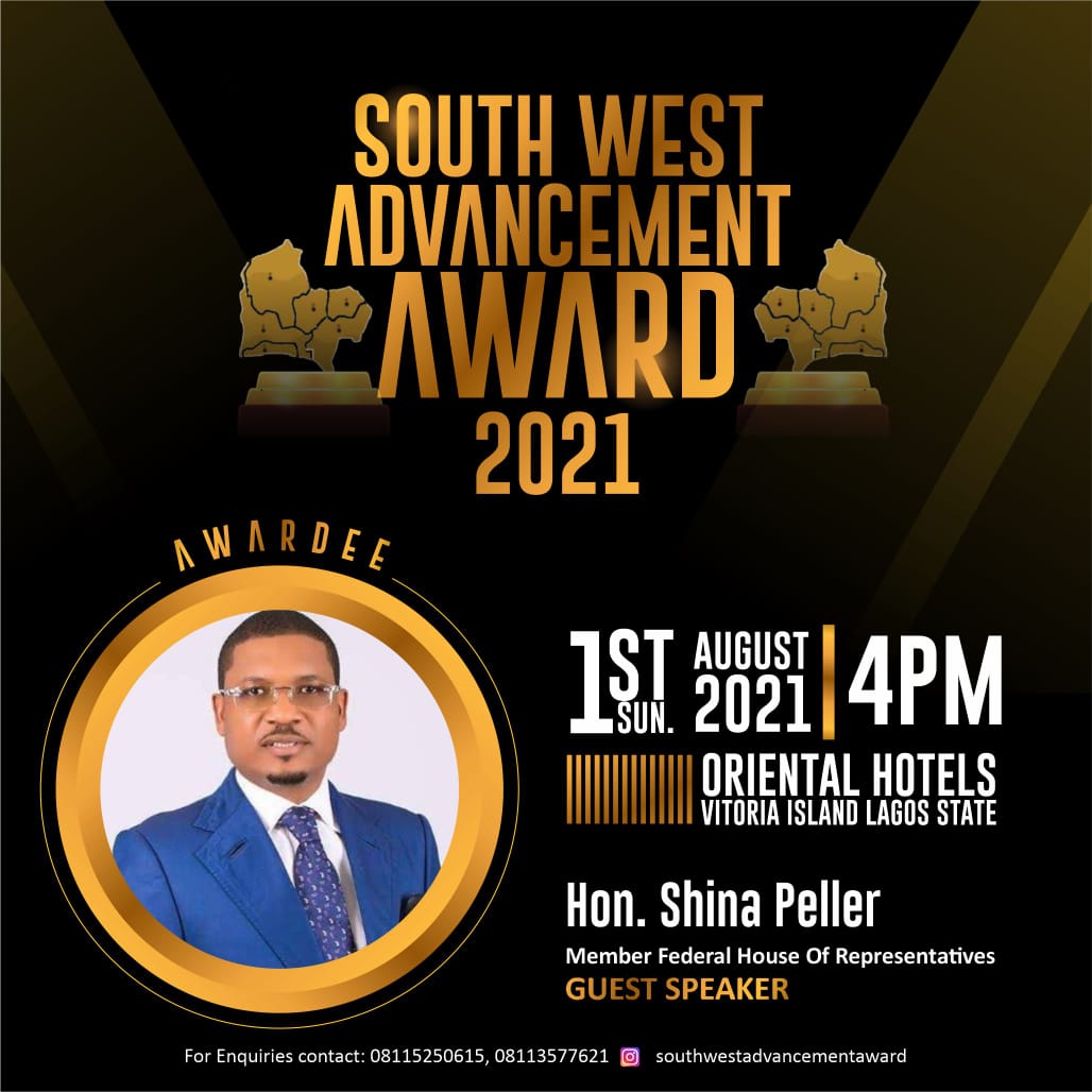 The South West Advancement Awards 2021 is Scheduled to hold on Sunday 1st August, 2021 by 4pm at the Oriental Hotels Victoria Island Lagos State Nigeria.