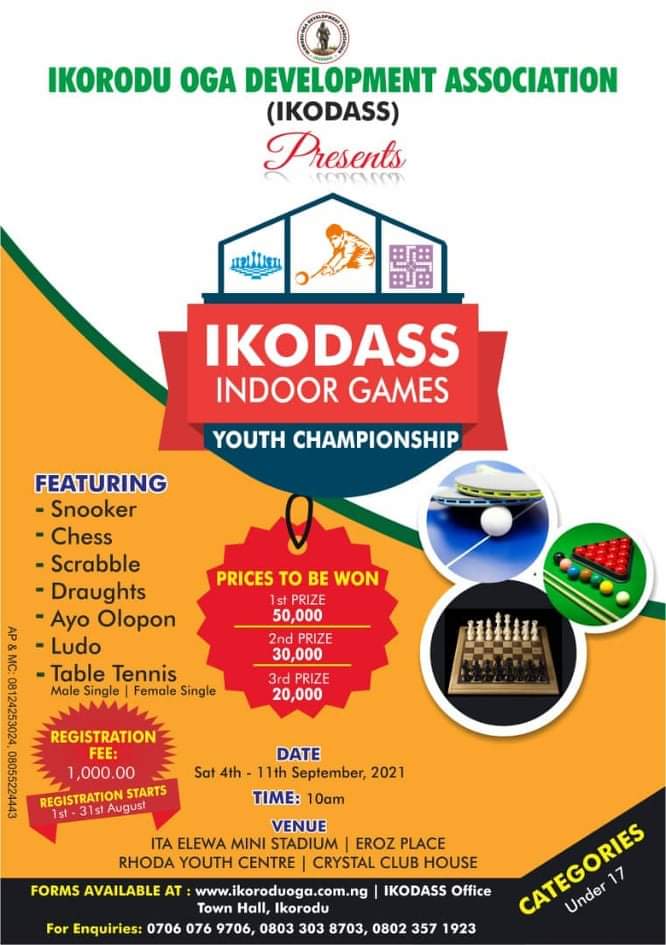 The sporting event, tagged, ‘IKODASS Indoor Games Youth Championship’, will accommodate U -17 participants and will be held between Saturday, September 4 and Saturday, Saturday 11, 2021, at four centres – Ita Elewa Youth Centre, Eroz Place, Crystal Club and Rhoda Youth Centre.