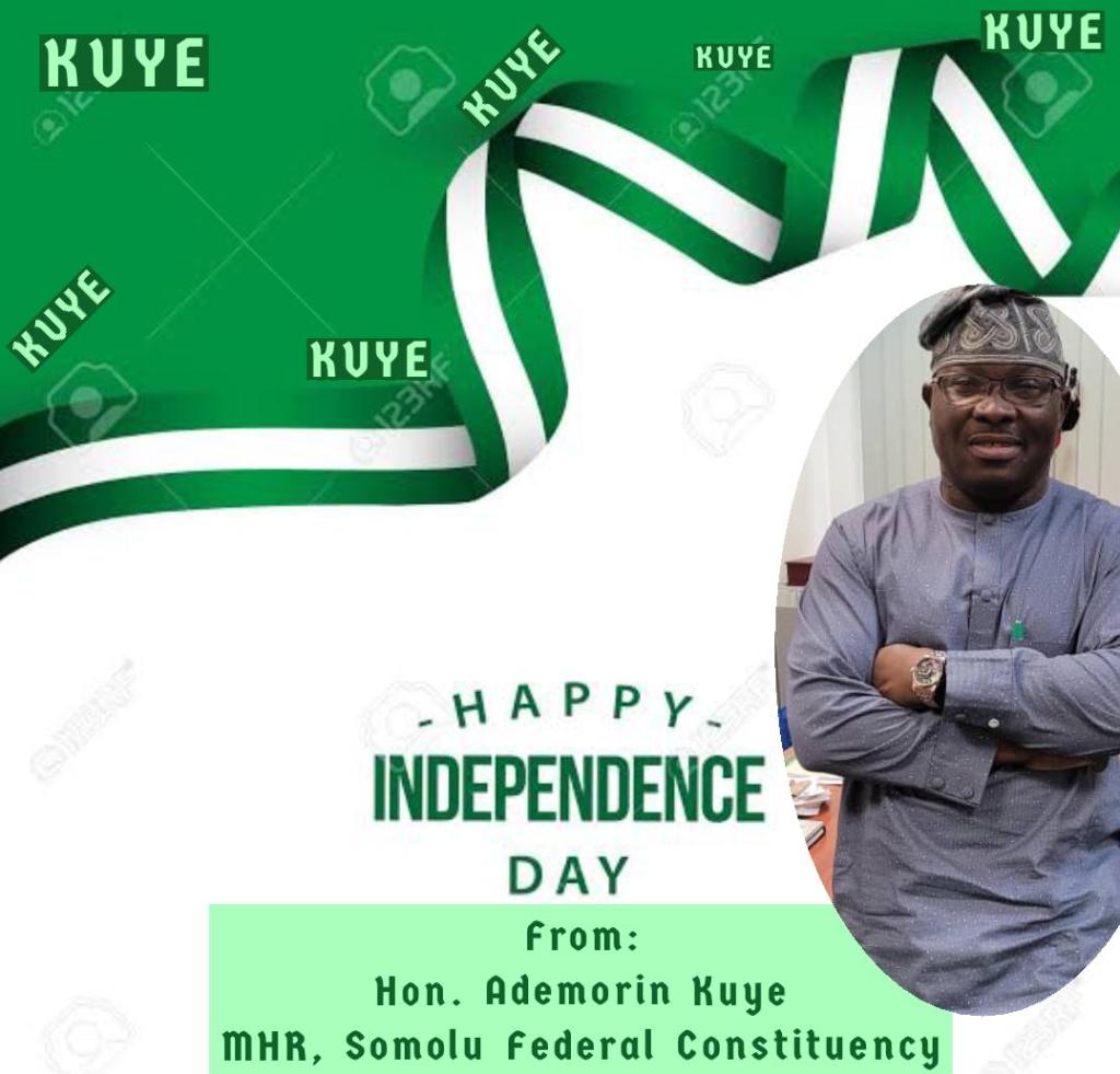 Hon. Ademorin Kuye, member representing the industrious people of Somolu Federal Constituency at the Green Chamber, today at his Lagos residence forwarded his independence message through his Media Aide, Hon. Mayowa Adeoye to the press.