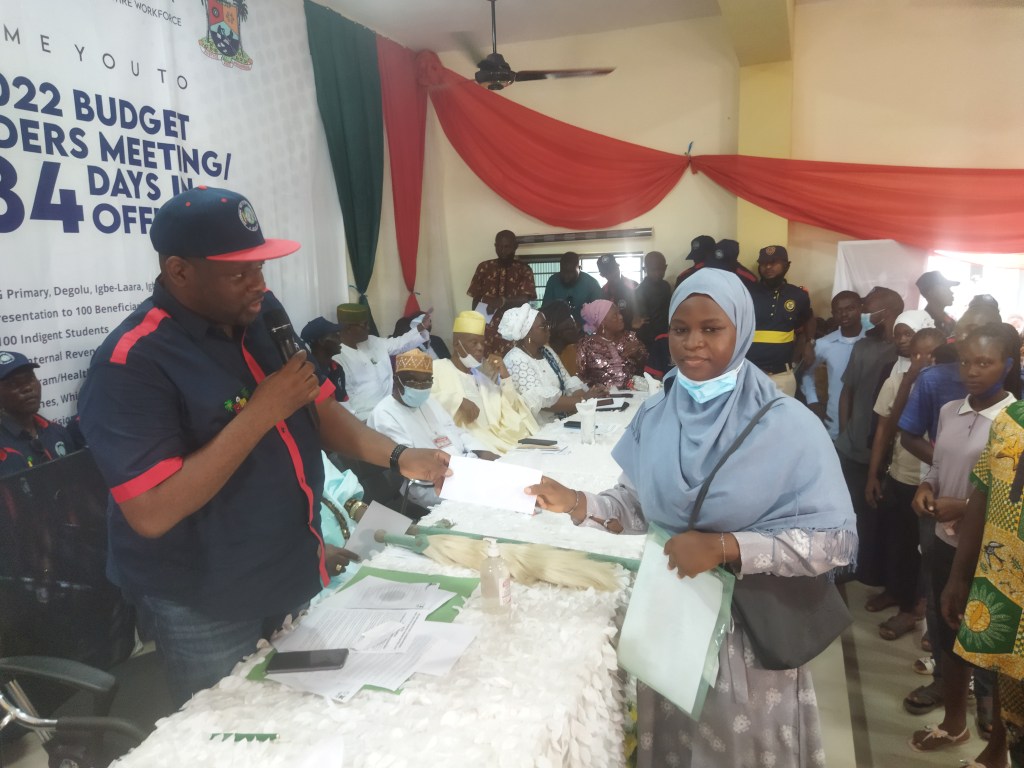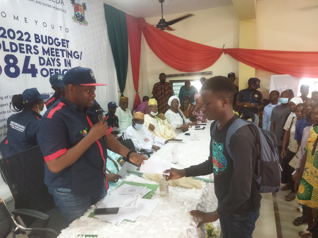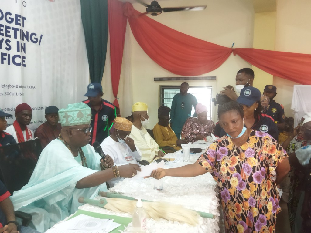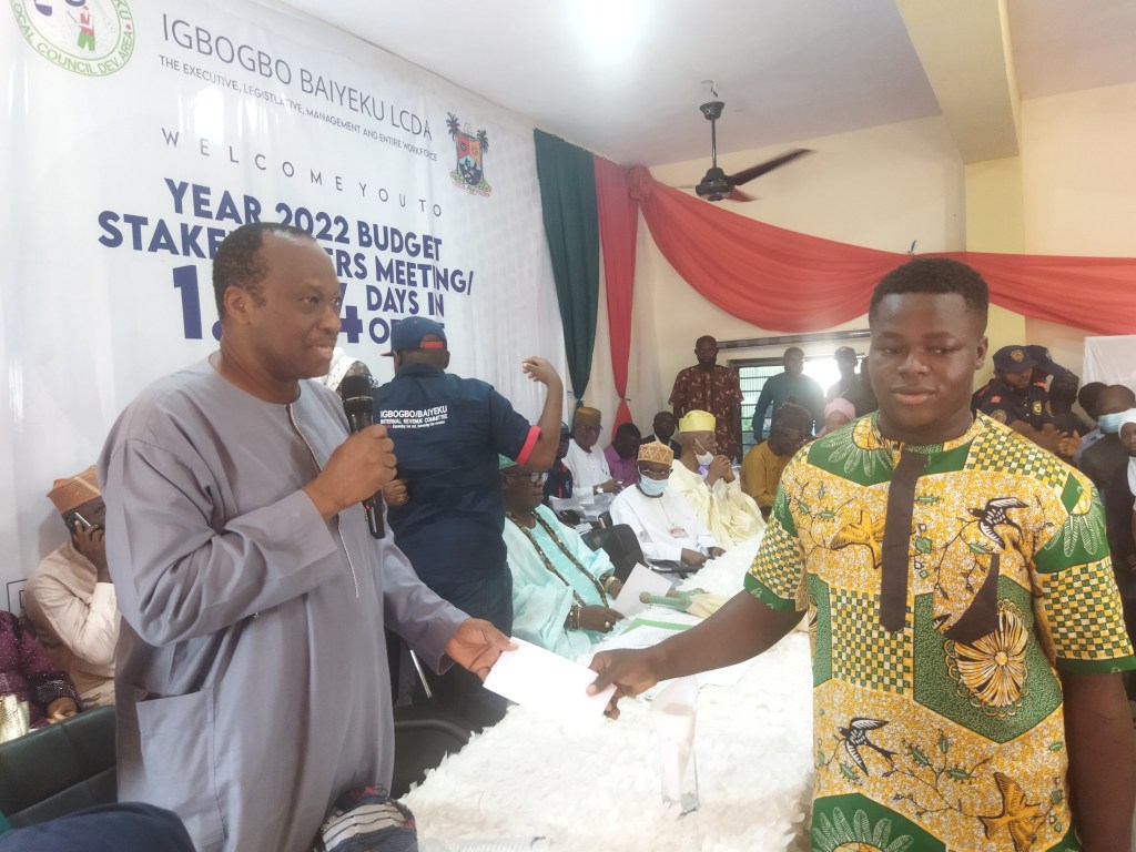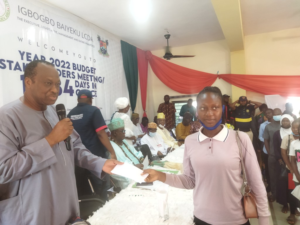 The Executive Chairman of Igbogbo-Baiyeku LCDA BLDR. Olusesan Daini gives Account of Stewardship since assumption of office as a Council Boss, in the same vein he gives Bursay to 100 Students Indegene of Igbogbo-Baiyeku, also gives 20 old people the sum of 20,000 to cater for their needs at home.
