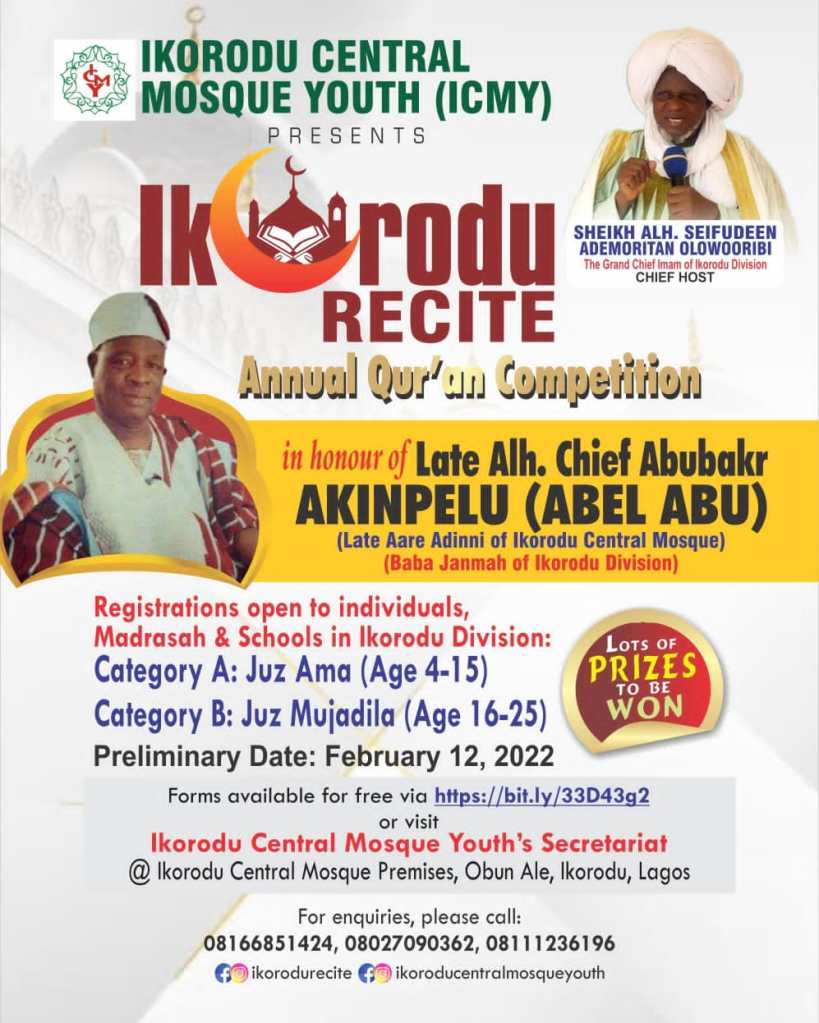The Ikorodu Recite 1.0 shall be held in honor of Late Alh. Chief Abu Bakr Akinpelu (Abel Abu) who was until his death, the Aare Adinni Of Ikorodu Central Mosque as well as Baba Janmah of Ikorodu division, the position which he earned due to his immense contribution to the growth of Islaam and dawah in Ikorodu division. We want to use this medium to appreciate his family for welcoming us and accepting the proposal to host the program, may Almighty Allah continue to shower His mercies on Baba Abel Abu, may He grant him Aljannah Firdaus.