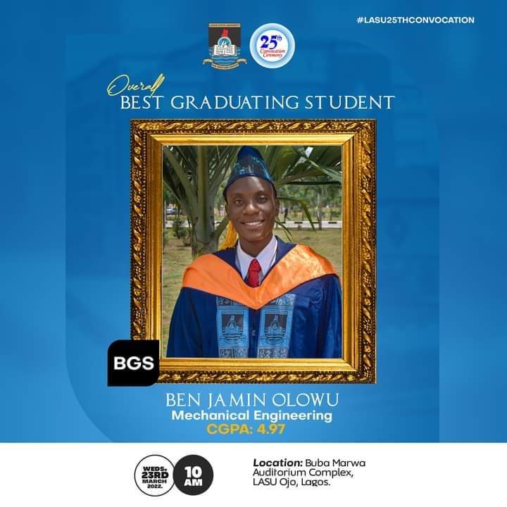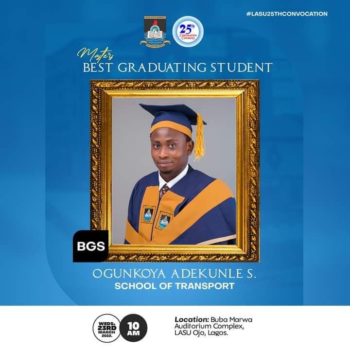 The Vice Chairman of the National Youth Council of Nigeria Lagos East Senatorial District has Congratulated Mr Ogunkoya Adekunle Steven who emerges the best graduating post graduate student at the 25th Convocation ceremony of the Lagos State University held on Wednesday 23rd March, 2022 at the Buba Marwa Auditorium Complex.