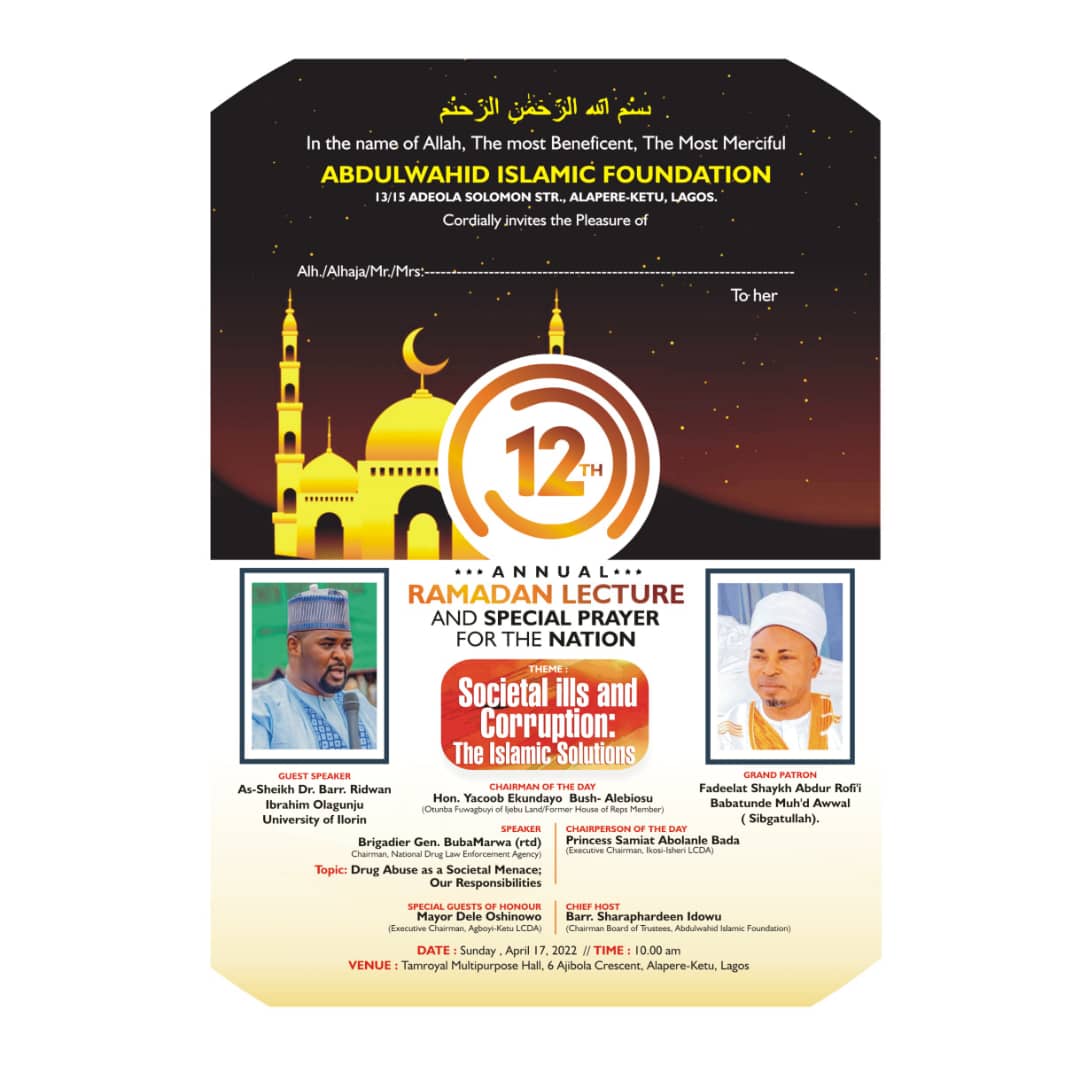 The Abdulwahid Islamic Foundation is set to host the 2022 Ramadan lecture and Special prayers for the Nation.