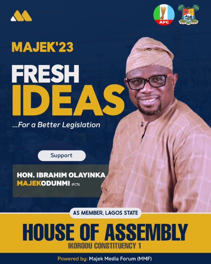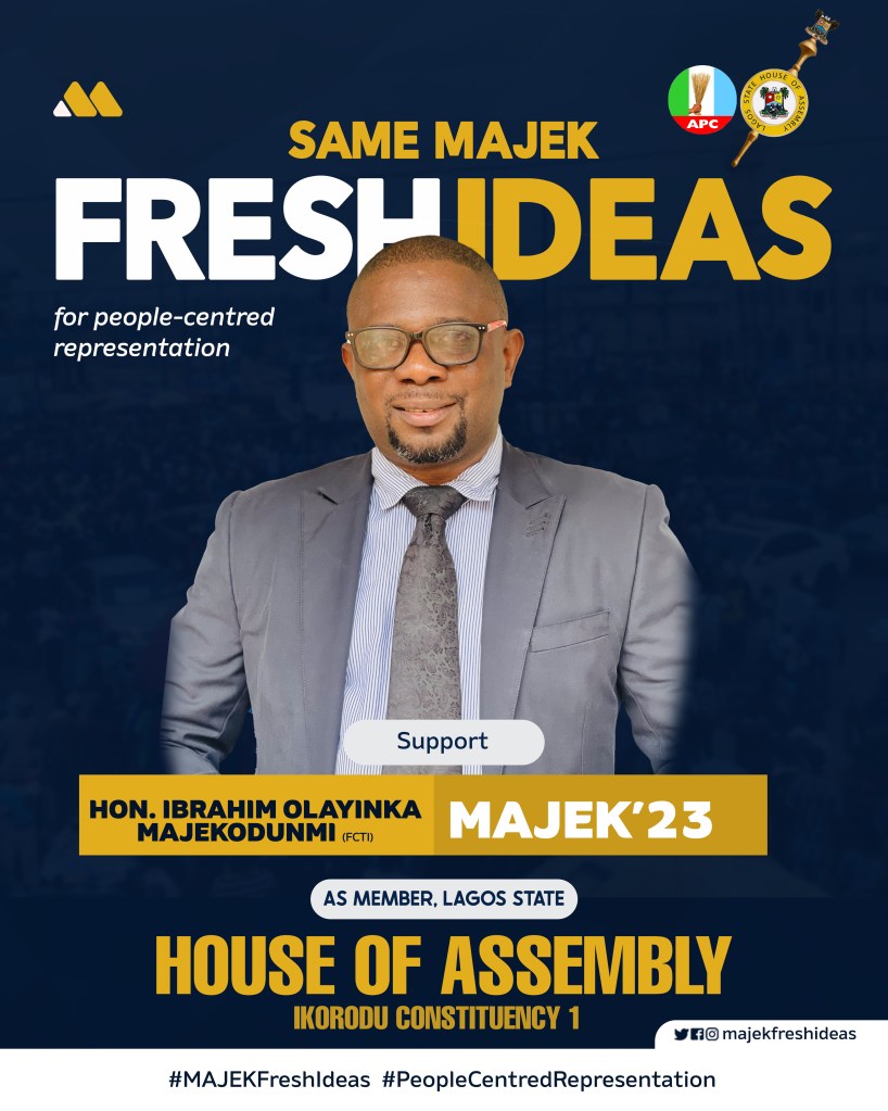 “It is on this note, I, Ibrahim Olayinka Majekodunmi, humbly present to you my FRESH IDEAS and REDIFINED REPRESENTATION Plans to contest in the Lagos State House of Assembly Elections 2023 for the progressive people of Ikorodu Constituency 1.”