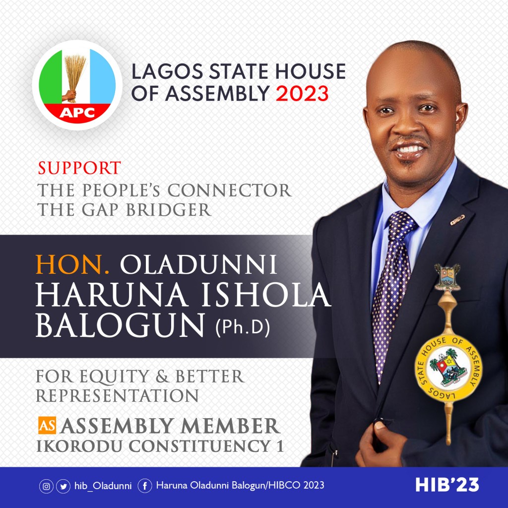 The Gap Bridger & The People’s Connector Hon. (Dr.) Oladunni Haruna Ishola Balogun. He is a dynamic, resourceful and rugged politician full of vigor, who stands to maintain and increase the dividends (output) of democracy for his people (Ikorodu L.G., Ikorodu North and Ikorodu West), through scientific and entrepreneurial approach for new innovations in legislation.