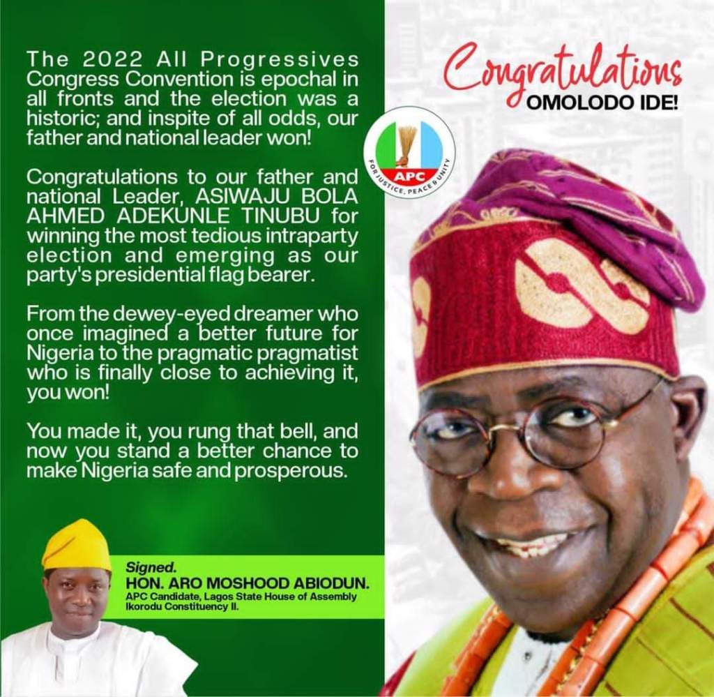 Congratulations to our father and national Leader, Asiwaju Bola Ahmed Adekunle Tinubu for winning the most tedious intraparty election and emerging as our party’s presidential flag bearer.