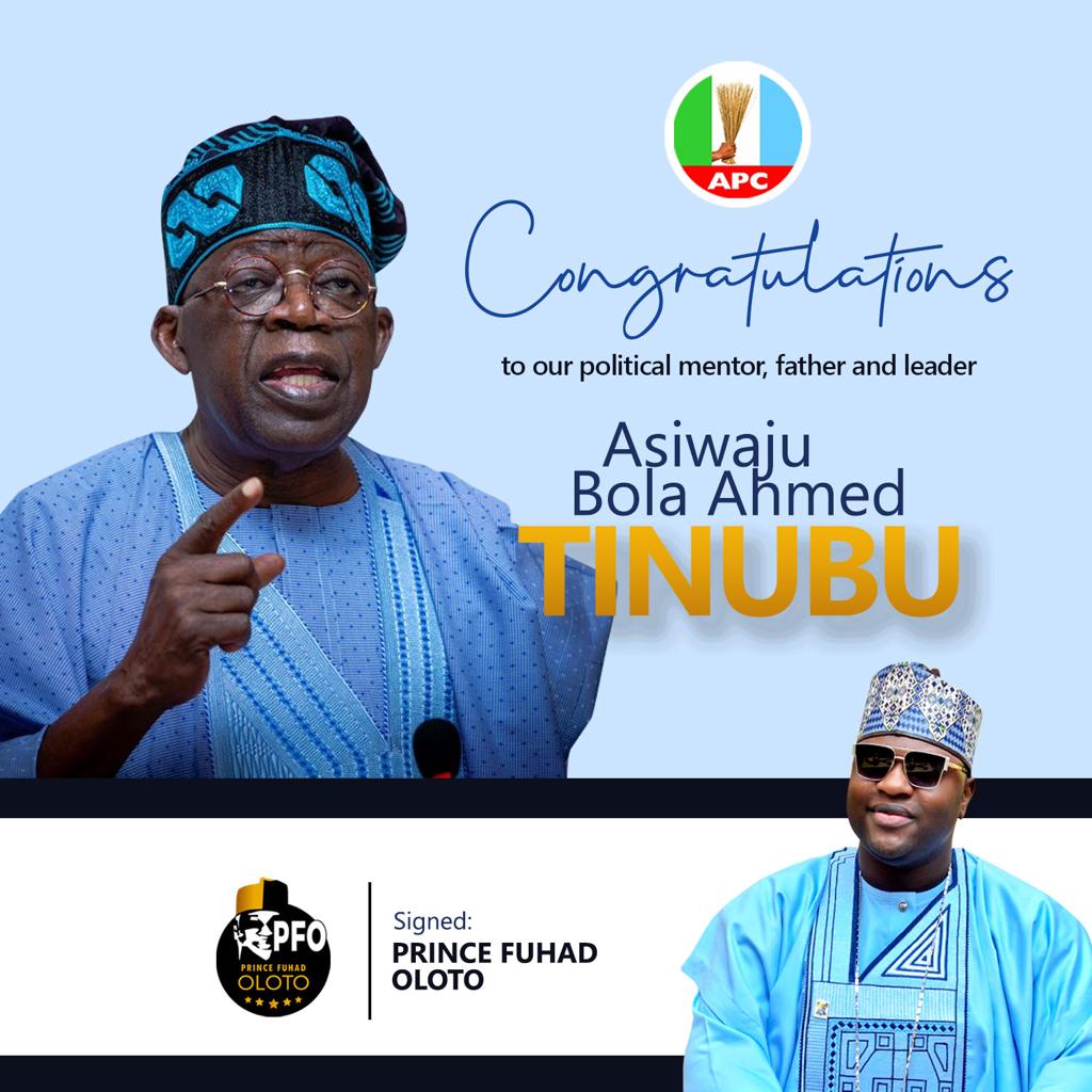 Prince Fuad Oloto CEO FUTOL HOMES has Congratulates Asiwaju Bola Tinubu “Our mandate, our rallying point, ASIWAJU BOLA AHMED TINUBU as he emerge the presidential flagbearer of our great party; All progressive congress, I’m entirely pleased with your mandate and magnanimous victory.”