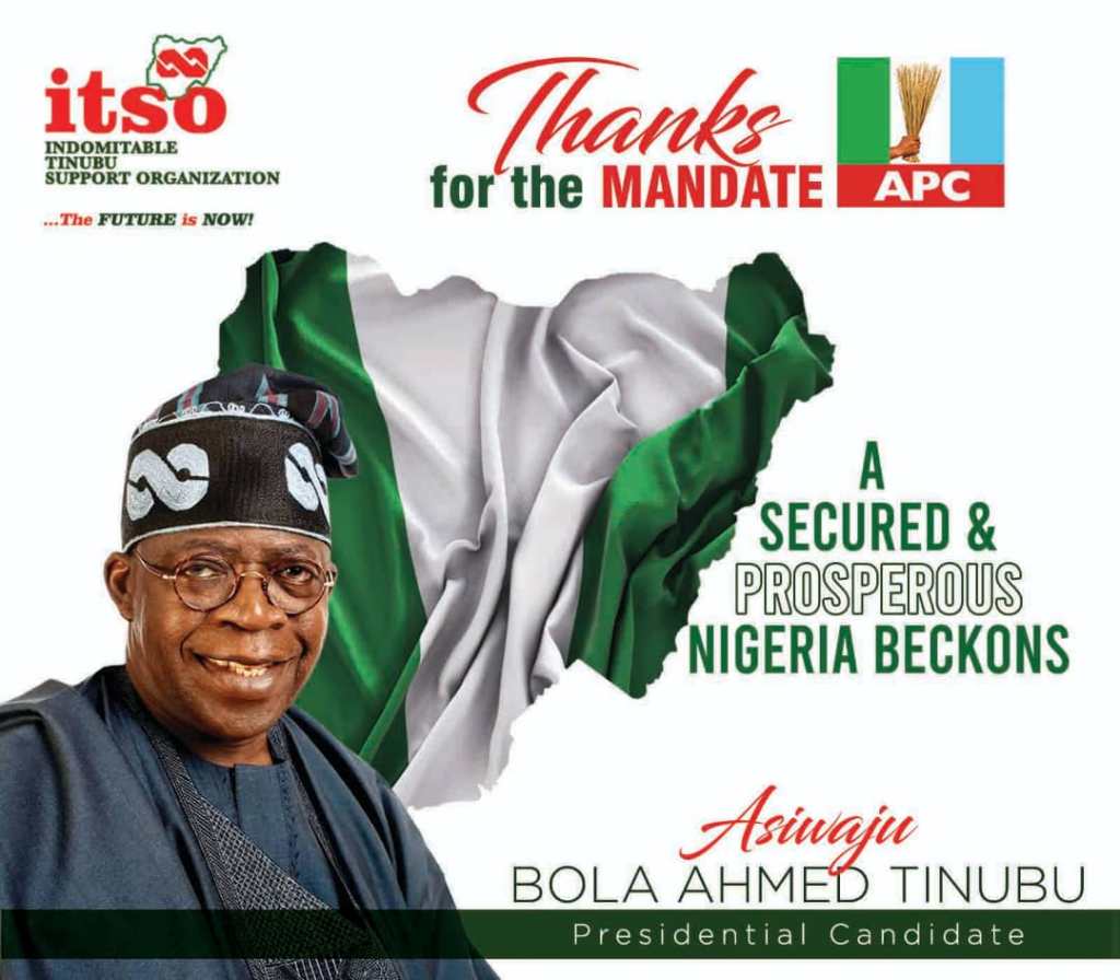 The Indomitable Tinubu Support Organisation (ITSO) wishes to congratulate our symbol, our mandate, our rallying point, ASIWAJU BOLA AHMED TINUBU as he emerge the presidential flagbearer of our great party; All progressive congress. We are entirely pleased with your mandate and magnanimous victory.