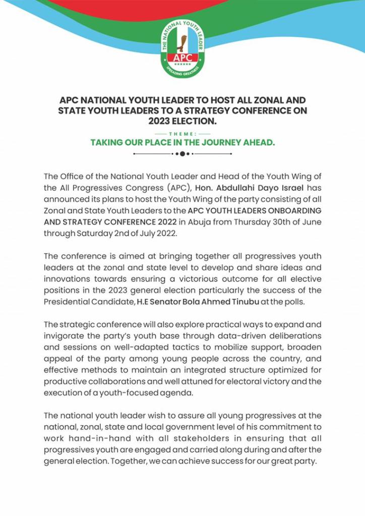 The Office of the National Youth Leader and Head of the Youth Wing of the All Progressives Congress (APC), Hon. Abdullahi Dayo Israel has announced its plans to host the Youth Wing of the party consisting of all Zonal and State Youth Leaders to the APC YOUTH LEADERS ONBOARDING AND STRATEGY CONFERENCE 2022 in Abuja from Thursday 30th of June through Saturday 2nd of July 2022.