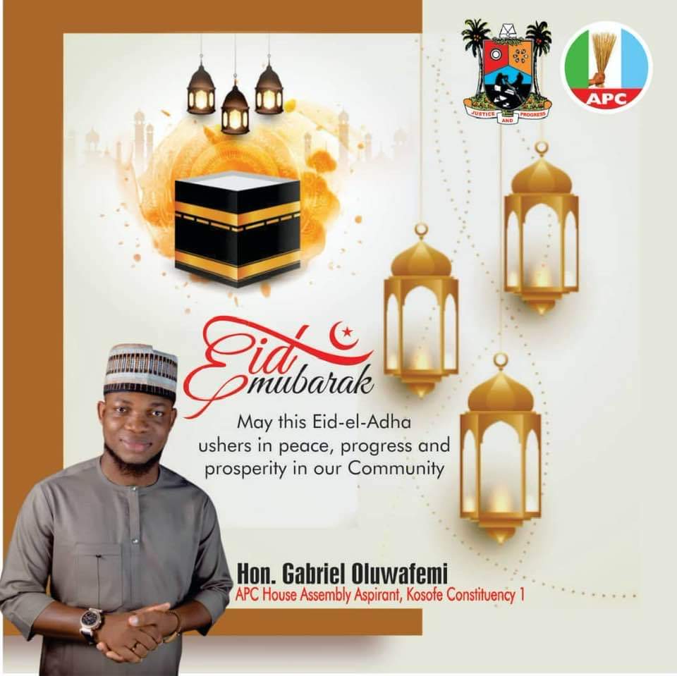 As Muslim faithfuls celebrate Eid-el-Kabir, the All Progressives Congress House of Assembly Aspirant, Kosofe Constituency 1, Hon. Oluwafemi Gabriel, has urged Muslim brothers and sisters in Kosofe local government to continue to uphold and promote the core values of Islam for the sustenance of peace, unity and progress of the country.