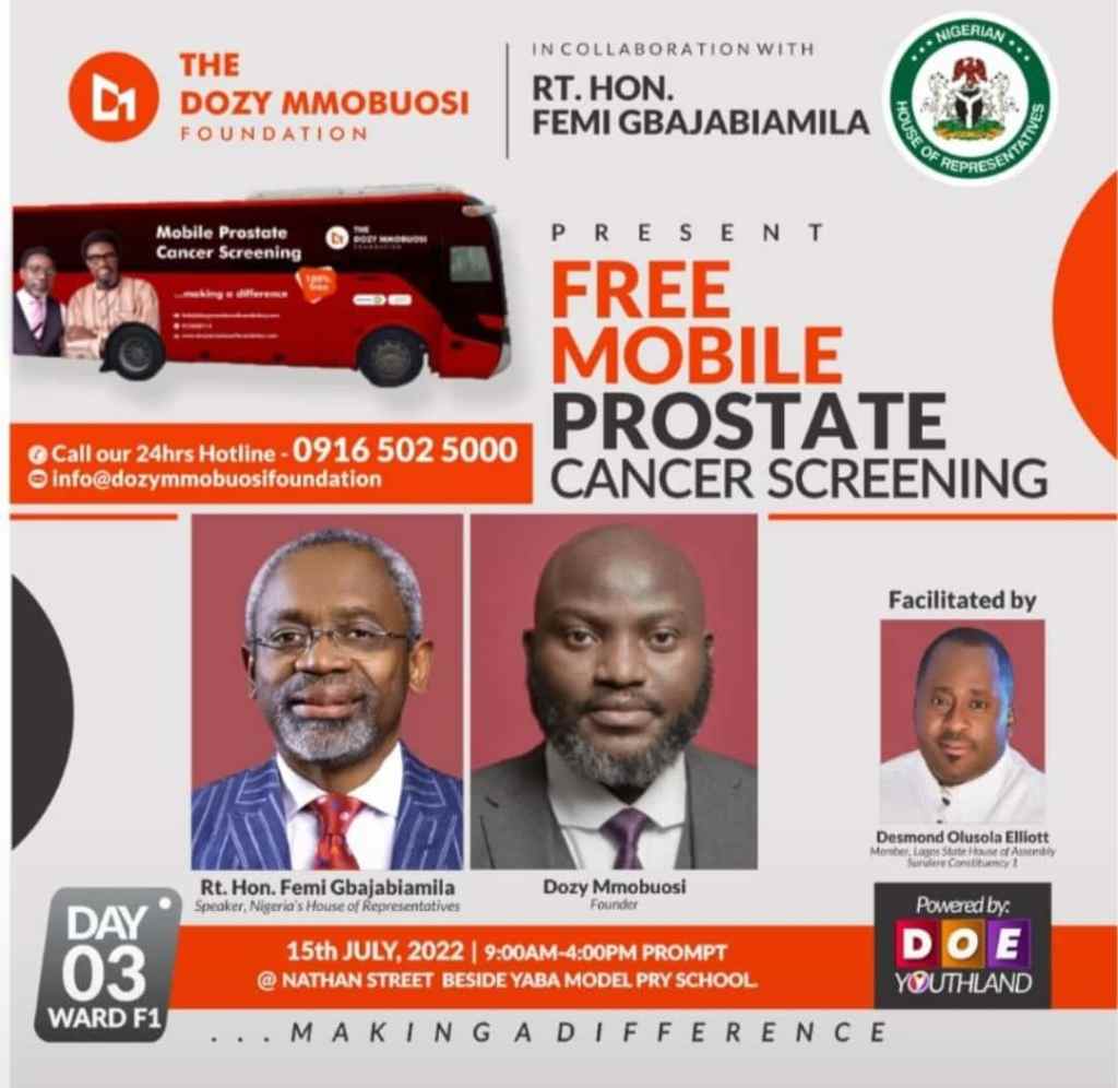 The Dozy Mmobuosi foundation in partnership with Rt Hon. Femi Gbajabiamila provides free Prostate cancer screening for Surulere constituents facilitated by Hon. Desmond Olusola Elliott member Lagos State House of Assembly, Surulere Constituency 1, and powered by DOE YOUTHLAND, yesterday was the turn of ward F1.