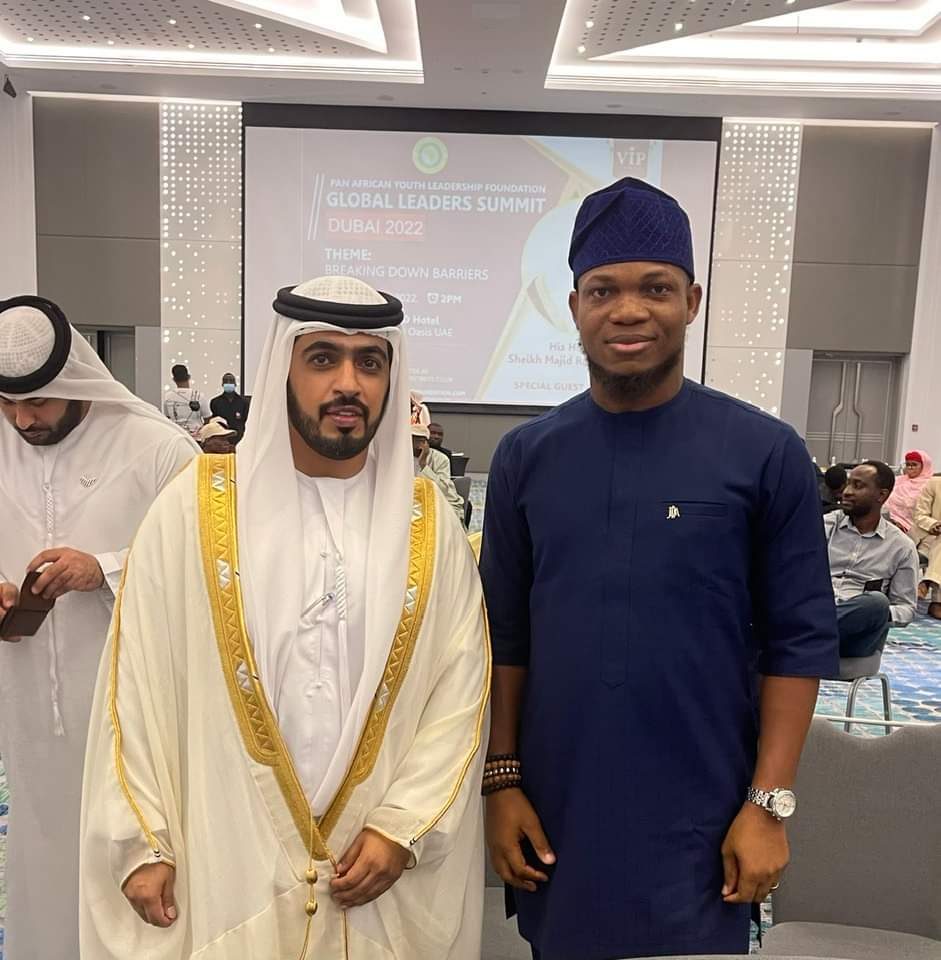 The investiture which came up under Pan African youth leadership foundation, Global leaders summit with a theme: ‘Breaking down barrier’ Dubai 2022 was held at Raddisson RED Hotel, Dubai and attracted creme de la creme in United Arab Emirates, including His Royal Highness, Sheik Majid Al Mullah. who was the special guest of honour at the event.