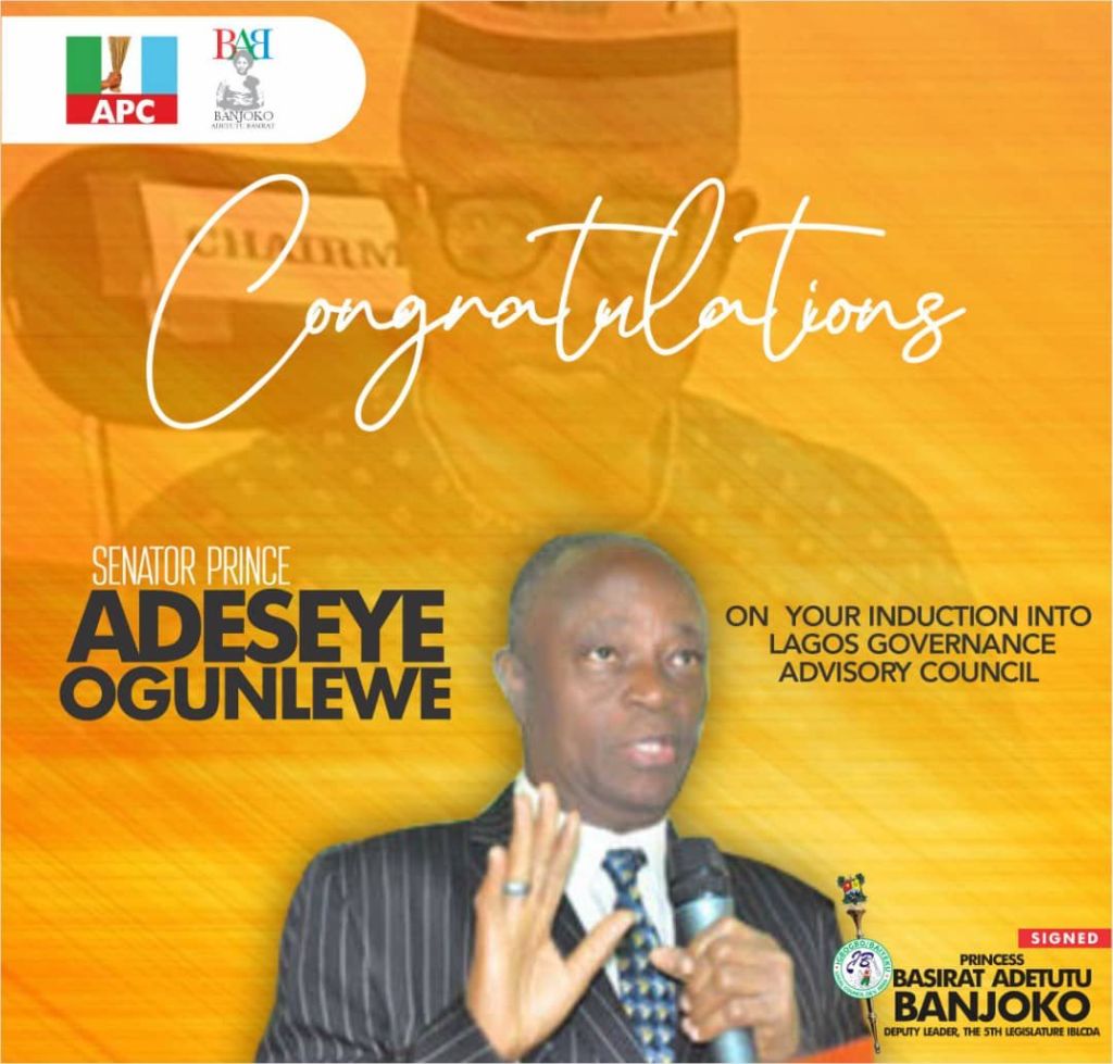 Congratulations the Distinguished Senator Kingsley Adeseye Ogunlewe on your well-deserved appointment to the Governor’s Advisory Council (GAC), the highest decision-making body of the All Progressives Congress (APC) in Lagos.