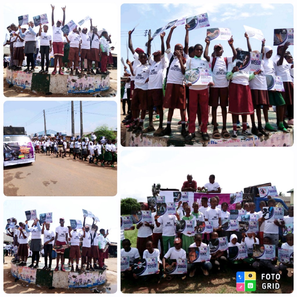 Secondary students from different schools gathered with placards which says no to social vices; cultism, street fighting, drug abuse, killing, cybercrime, gambling, thuggery, stealing, smoking, improper waste management and indecent dress.
