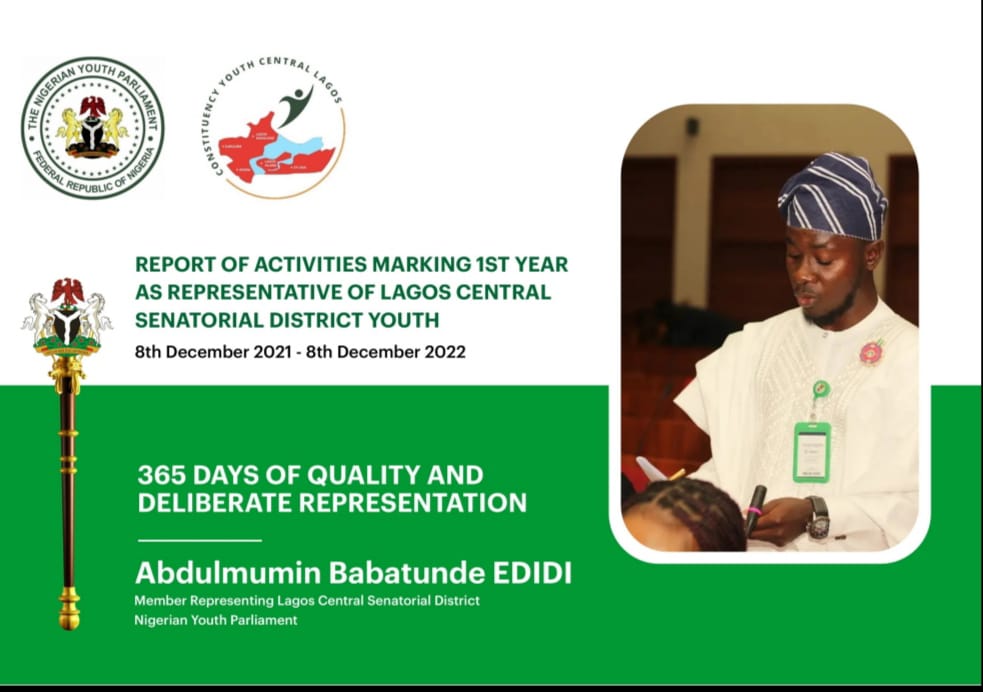 Abdulmumin Edidi the Representative of Lagos Central Senatorial District in the Nigerian Youth Parliament, Chairman House Ad-hoc Committee on Drug and Substance Abuse Control Dec 2021 – Dec 2022, Chairman House Ad-hoc Committee on Research and Policy Development Feb 2022 – Dec 2022, and currently Chairman House Committee on Works and Housing has reeled out his achievements during the first year as Youth Representative in the Nigerian Youth Parliament.