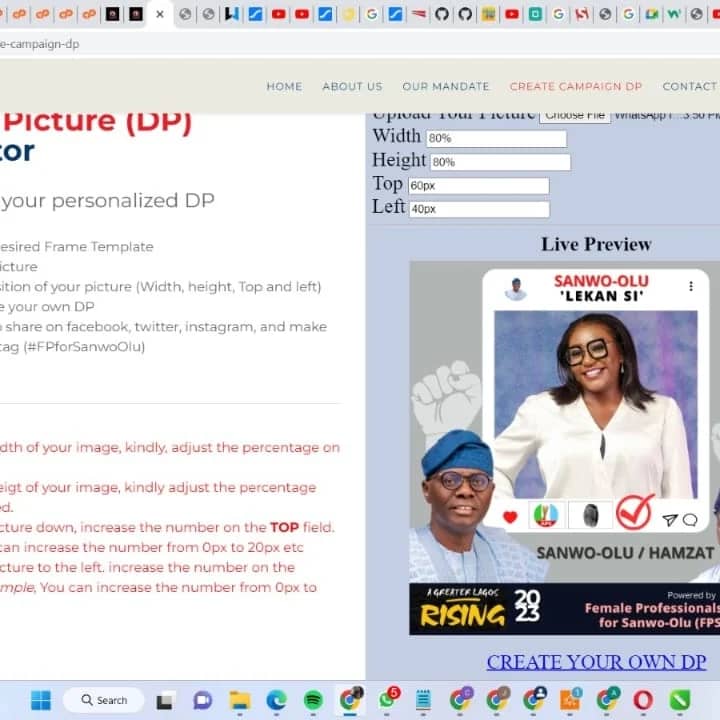 Visit www.https://fpforsanwoolu.com/ to generate your freeel campaign frames for Asiwaju Bola Tinubu and Babajide Sanwo-Olu 2023.