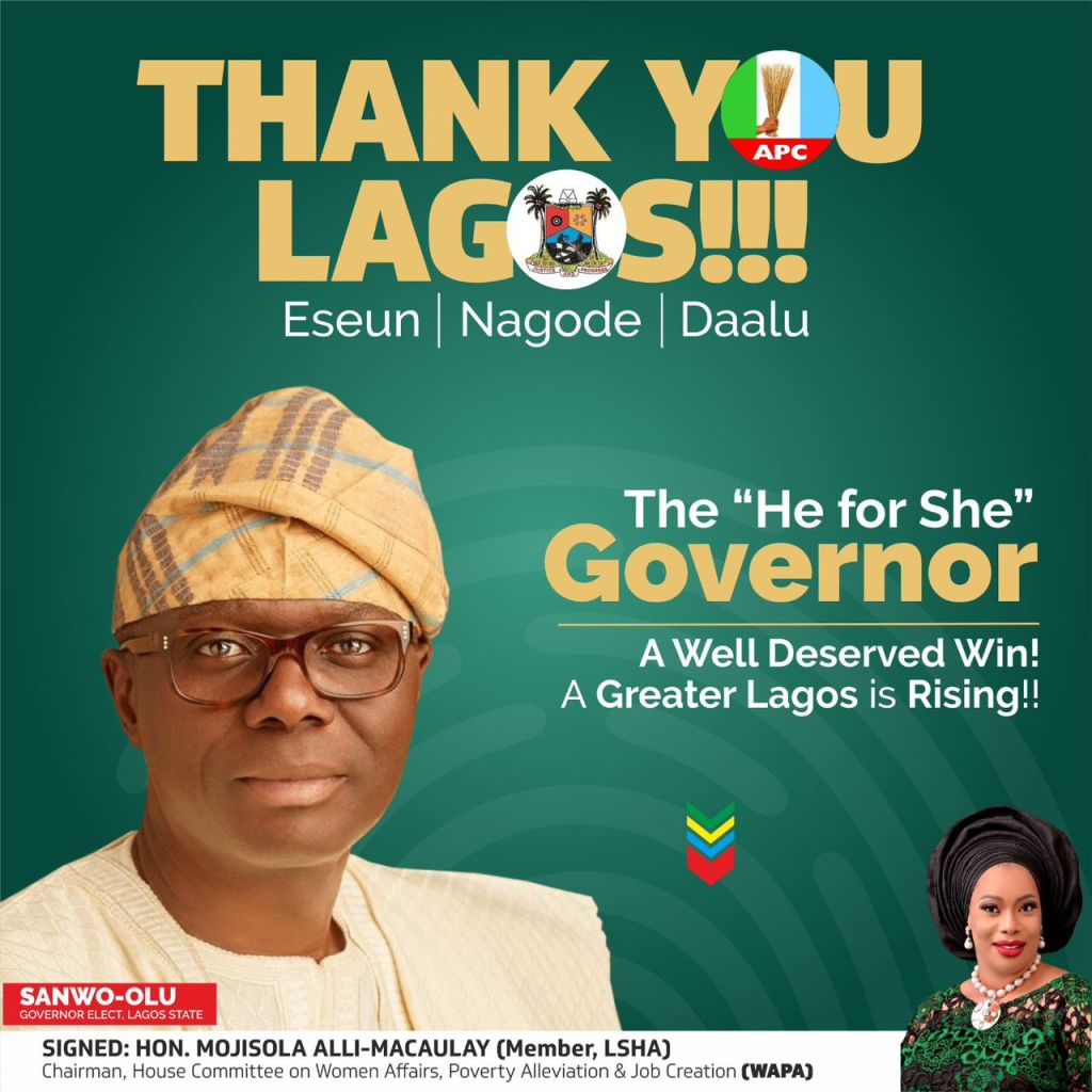 Honourable Mojisolaoluwa Alli-Macaulay, the Chairman House Committee on Women Affairs and Poverty Alleviation at the Lagos State House of Assembly expresses her heartfelt congratulations to the HeforShe Governor, Mr. Babajide Sanwo-Olu, and his Deputy, Dr. Kadiri Hamzat, on their well-deserved reelection as the Governor and Deputy Governor of Lagos State, respectively.