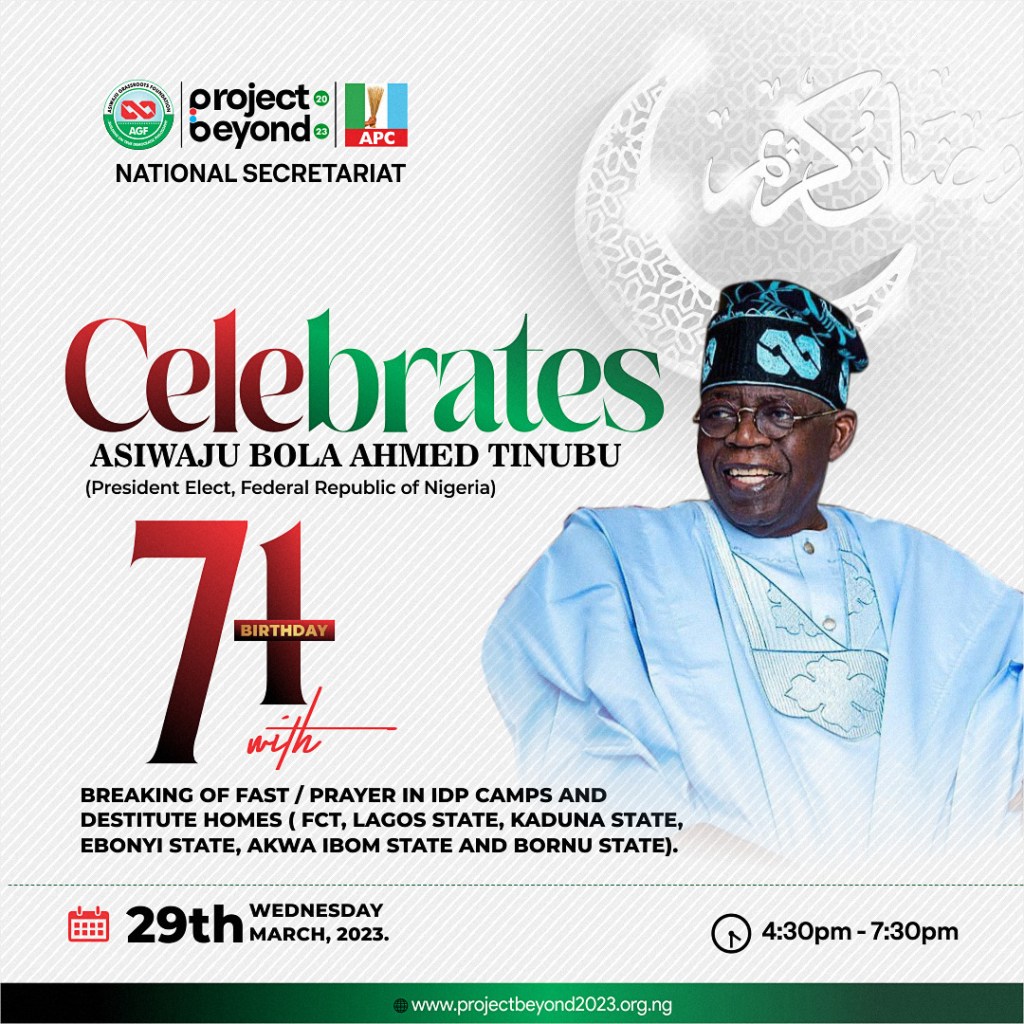 “In line with the directive of the President-Elect, His Excellency Asiwaju Bola Ahmed Tinubu, that, his 71st birthday should be marked with prayers, we at Asiwaju Project Beyond 2023 are also towing this line. The breaking of fasts and prayers as well as support to internally displaced persons, is a way of carrying out his wish and celebrating him.