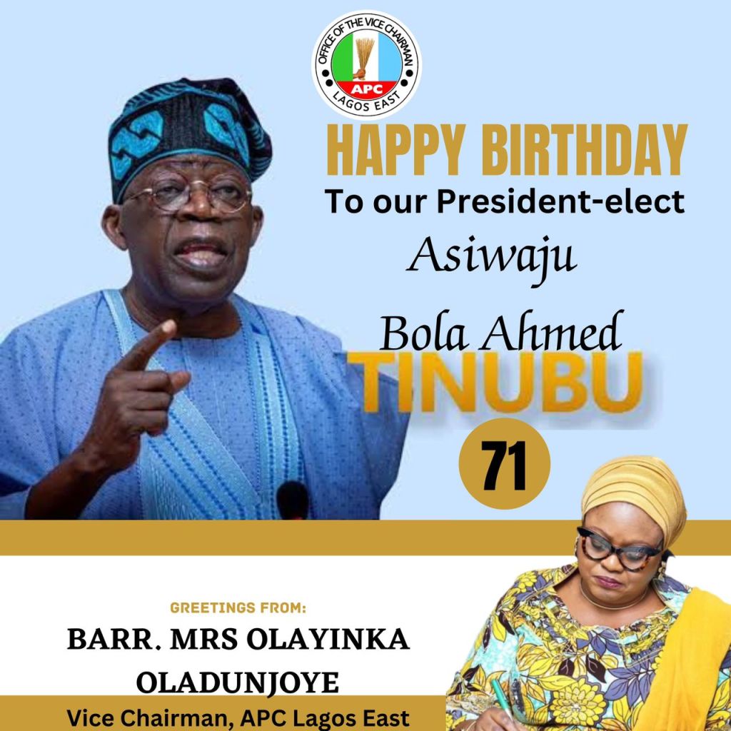 The Lagos East All Progressive Congress, APC, Vice-Chairman, Barrister Olayinka Oladunjoye, has congratulated the President-Elect of the Federal Republic of Nigeria, Asiwaju Bola Tinubu, on the occasion of his 71st birthday.