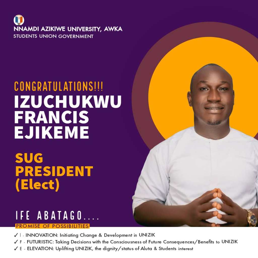 Nnamdi Azikiwe University has elected Comr. Izuchukwu Francis Ejikeme as its 30th Students Union Government (SUG) President. According to a statement released by Comr. Ismail O. Ashiru, Ejikeme’s victory in the recent SUG election is a significant leap in student leadership.