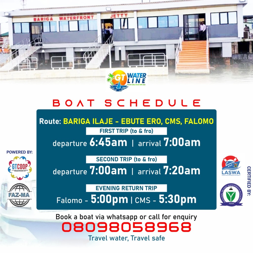 Daily trips out of Bariga Waterfront Jetty is scheduled btw 6.45 and 10am in the morning, with a return trip in the evening at 5pm from Falomo terminal and at 5.30pm from CMS Jetty.