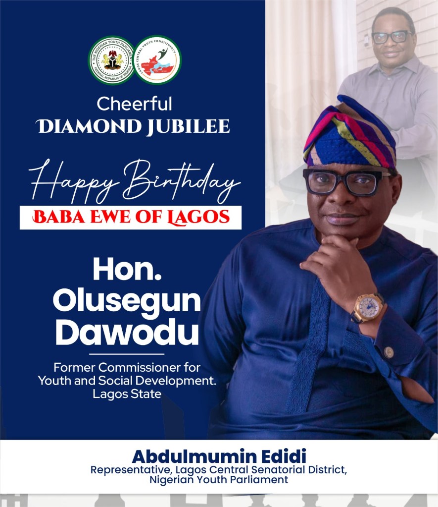 I, on behalf of young people across Lagos Central Senatorial District celebrate a Pacesetter, Mentor, Transformational Leader, and Father; Hon. Olusegun Dawodu, Former Commissioner for Youth and Social Development, and Baba Ewe of Lagos on this occassion of his Diamond Jubilee anniversary.