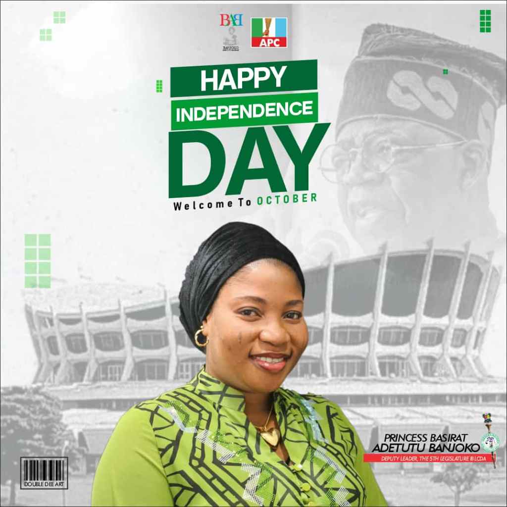Princess Basirat Adetutu Banjoko wishes the good people of Igbogbo-Baiyeku LCDA, Lagos state and Nigerians at large a joyous and memorable Independence Day celebration.