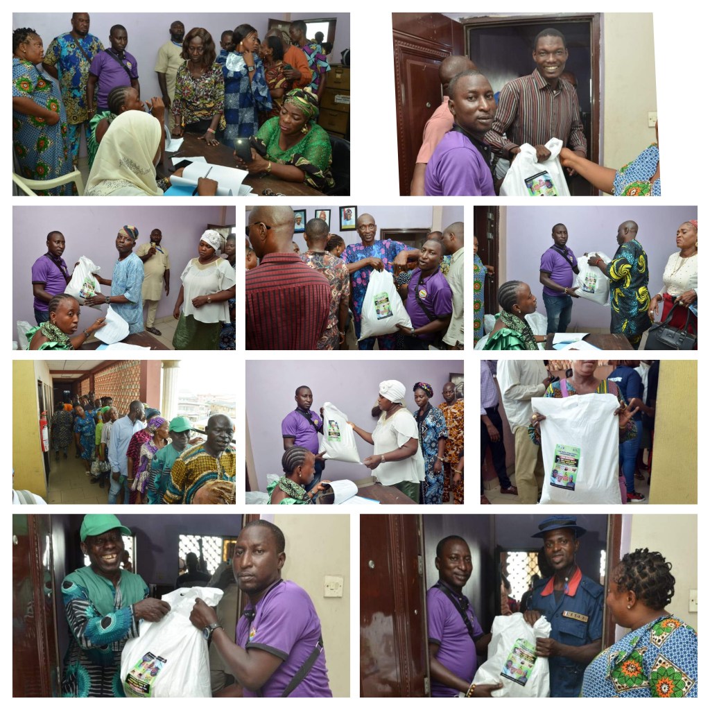 The Executive Chairman of Itire-Ikate local council development area, Hon. (Dr.) Ahmed Olanrewaju Apatira today distributed economic enhancement support food palliatives 𝑻𝒐 the entire staffs of the council at the council secretariat, Airways Rd. Ijesha