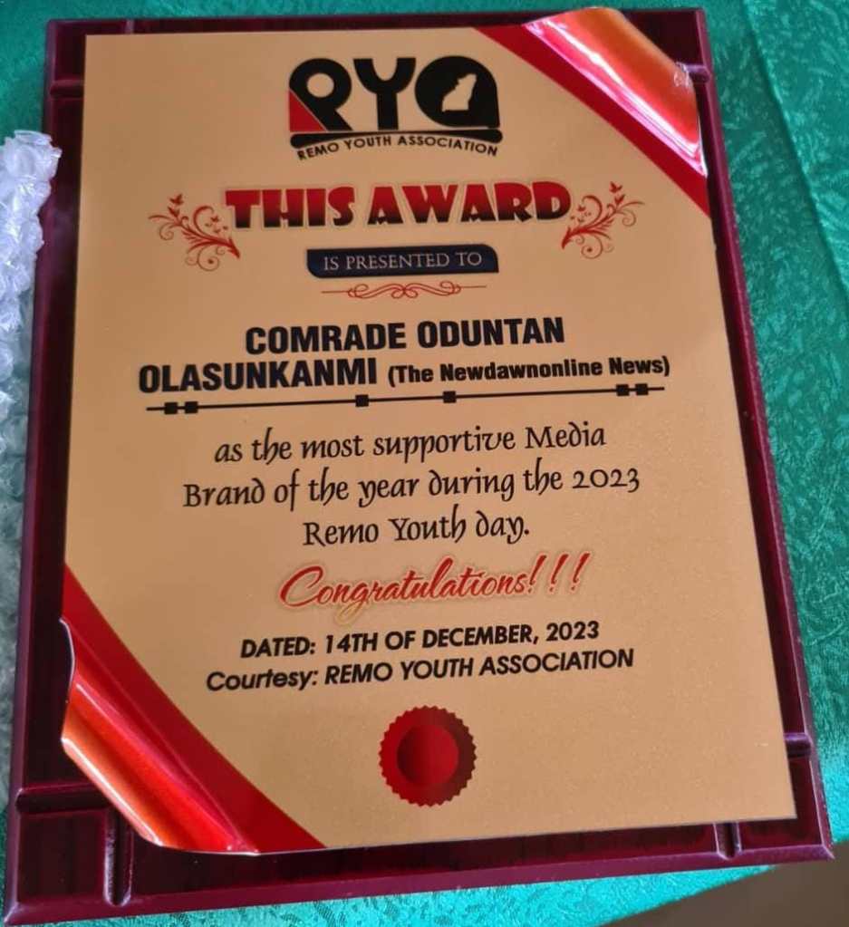 In a remarkable recognition event, “The New Dawn Online News- TNDOnline News” has been awarded the prestigious title of “Most Supportive Media Brand of the Year” by Remo YouthAssociation (RYA). The accolade was presented at the annual Remo Youth Day, 2023 edition held at Remo North LG of Ogun State, where TNDOnline News was lauded for its unwavering commitment to fostering positive social change through its diverse range of media initiatives.
