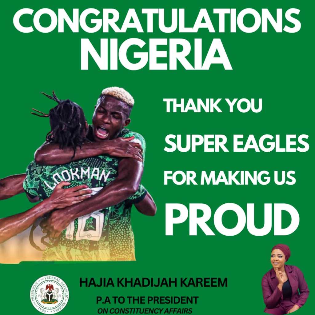 Alhaja Kareem Khadijat Omotayo, the Personal Assistant to President Tinubu, has joined President Bola Ahmed Tinubu and Nigeria Governors in congratulating the Super Eagles of Nigeria on their remarkable victory against the National Team of Cameroon. The Super Eagles’ qualification to the quarterfinals of the AFCON is no small feat and has brought immense joy to the nation.