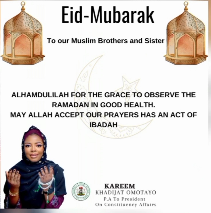Alhaja Khadijat Kareem Omotayo wished the Muslim faithfuls Eid Mubaraq and prayed that Almighty Allah blesses and spares our lives beyond.