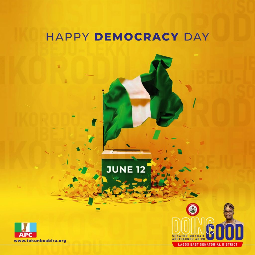 The Chairman, Senate Committee on Banking, Insurance and other Financial Institutions, who is also the Chairman, Southern Senators Forum, *Distinguished Senator Mukhail Adetokunbo Abiru, FCA* has felicitated with Nigerians on this year’s commemoration of Democracy Day. The Senator representing Lagos East Senatorial District, commended Nigerians for their steadfastness and patriotism, which has helped in deepening democracy in Nigeria in the last 25 years.