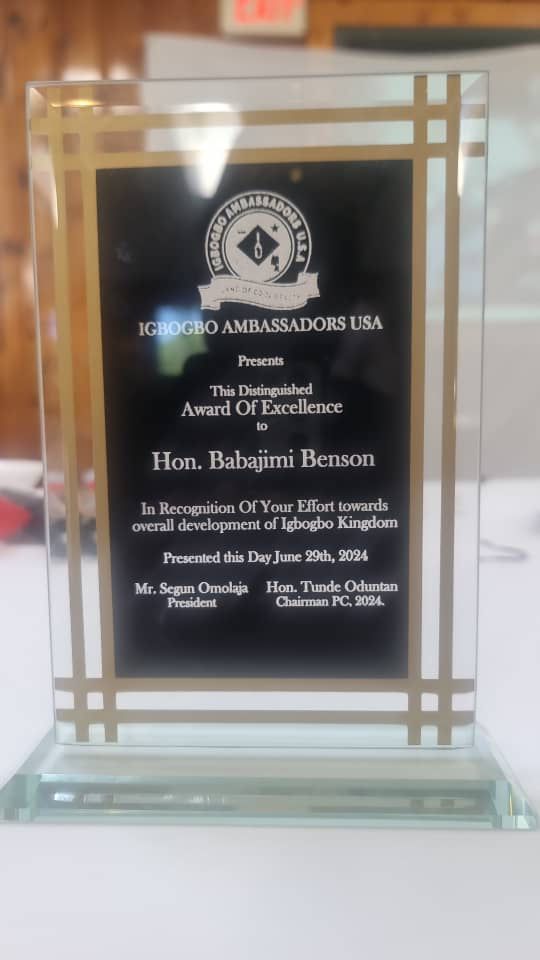 In a ceremony held as part of the 2024 Igbogbo Day USA celebrations, Rep. Babajimi Benson, member of the House of Representatives representing Ikorodu constituency, has been conferred with the prestigious Igbogbo Kingdom Indigenes Award of Excellence.