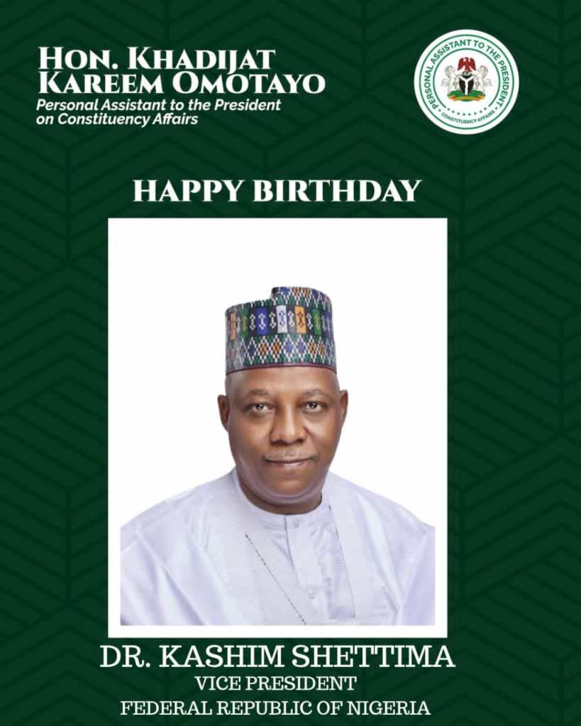 Hon. Khadijat Kareem Omotayo, Personal Assistant to the President on Constituency Affairs, has extended her warmest congratulations to His Excellency, Dr. Kashim Shettima, Vice President of the Federal Republic of Nigeria, on the occasion of his birthday.
