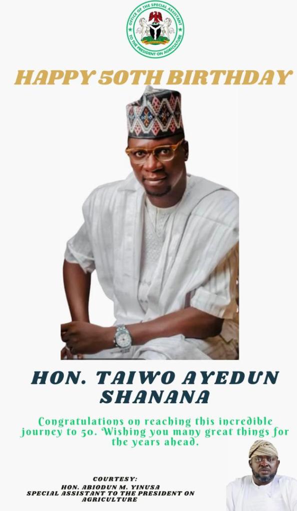 Hon. Abiodun Yinusa, Special Assistant to President Tinubu on Agriculture, has extended his warmest congratulations to Hon. Taiwo Ayedun, popularly known as Shanana, on the occasion of his 50th birthday.