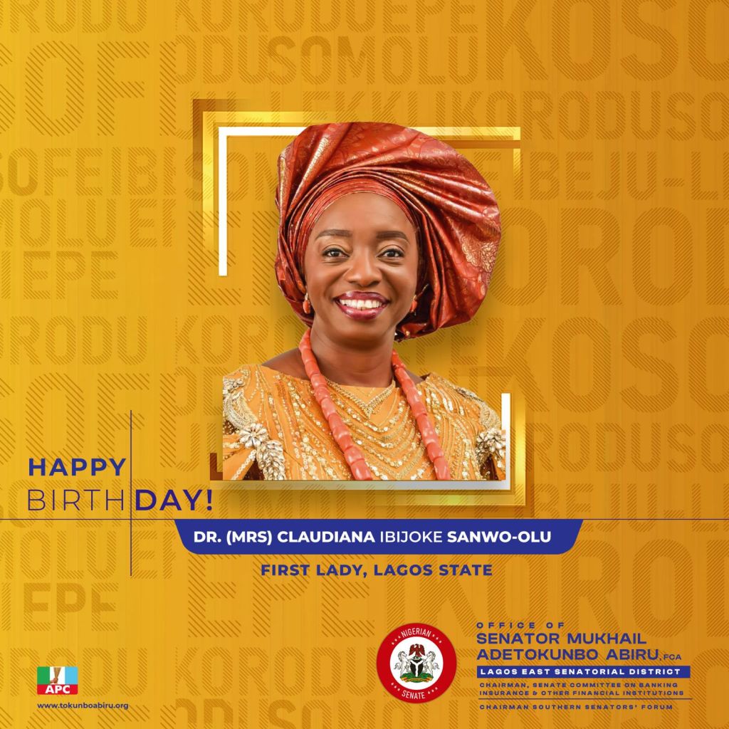 On behalf of my family and the good people of Lagos East Senatorial District, we extend heartfelt congratulations to Lagos State First Lady, *Dr. Claudiana Ibijoke Sanwo-Olu*, on the occasion of her birthday.