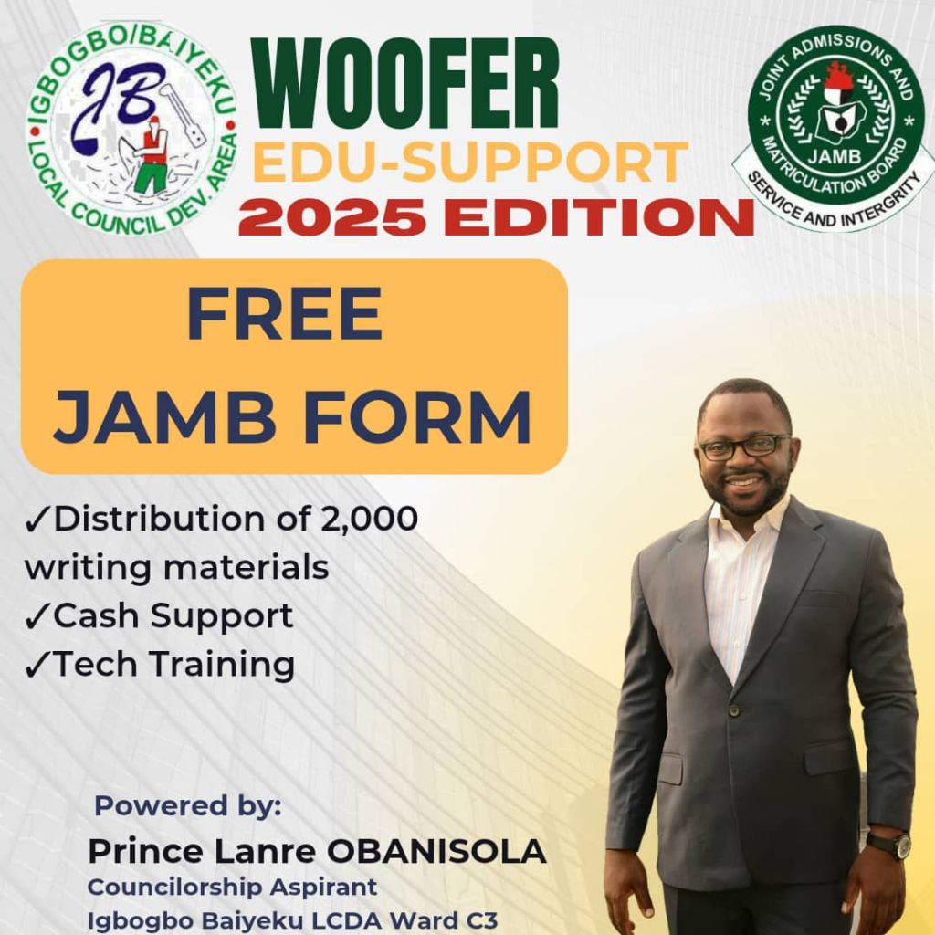 In a bid to support the educational pursuits of students in Ward C3, Igbogbo Baiyeku LCDA, Prince Lanre OBANISOLA, a councilorship aspirant in the area, has launched an initiative to provide free JAMB forms and writing materials to students and young public school pupils in the ward.