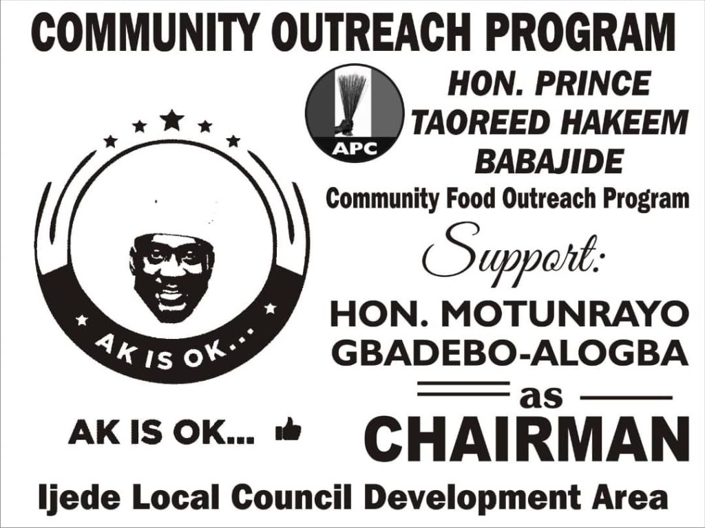 Hon. Taoreed Hakeem Babajide, popularly known as AK is OK, has launched a community food outreach program in Ijede, where he distributed 500 food palliatives and stipends for transportation to vulnerable residents. This initiative aims to support Hon. Motunrayo Gbadebo-Alogba’s bid for a second term as Chairman of Ijede LCDA.