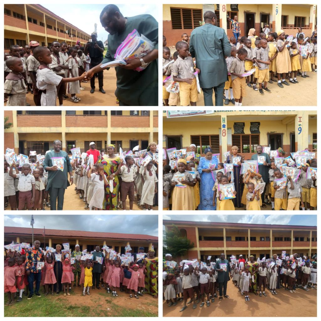In his usual way of supporting primary education, Builder Olusesan Daini, Executive Chairman of Igbogbo-Baiyeku LCDA, distributed educational materials to pupils of Methodist Primary School, AUD Primary School, and Eleja Primary School On Friday, May 9th. The materials include exercise books, biro, pencil, and eraser, which are essential tools for learning.
